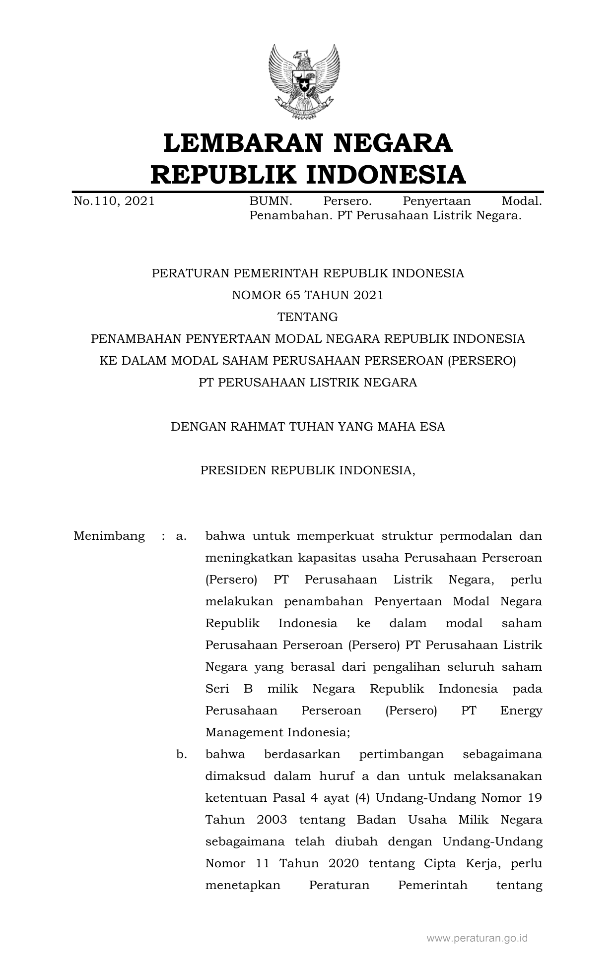 PP Nomor 65 Tahun 2021 | Peraturan Pemerintah Nomor 65 Tahun 2021 tentang PENAMBAHAN PENYERTAAN MODAL NEGARA REPUBLIK INDONESIA KE DALAM MODAL SAHAM PERUSAHAAN PERSEROAN (PERSERO) PT PERUSAHAAN LISTRIK NEGARA