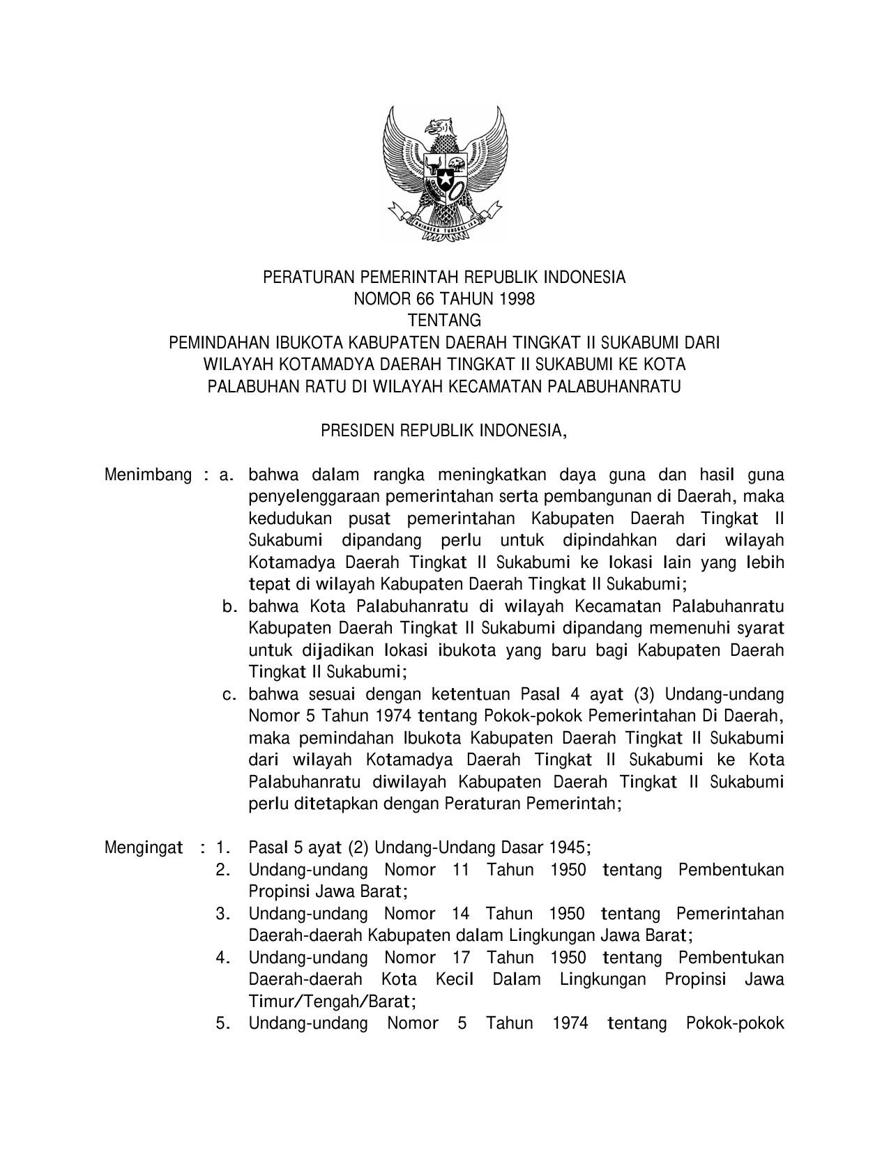 PP Nomor 66 Tahun 1998 | Peraturan Pemerintah Nomor 66 Tahun 1998 tentang PEMINDAHAN IBUKOTA KABUPATEN DAERAH TINGKAT II SUKABUMI DARI WILAYAH KOTAMADYA DATI II SUKABUMI KE KOTA PELABUHAN RATI DI WILAYAH KECAMATAN PELABUHAN RATU