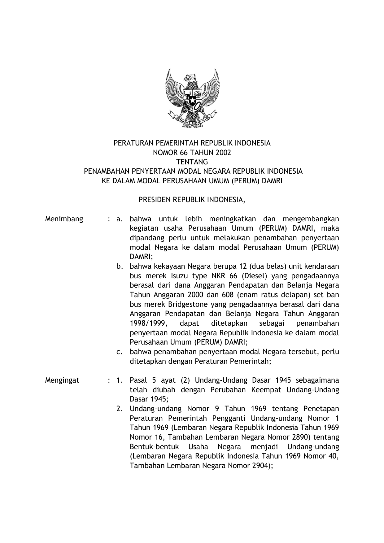 PP Nomor 66 Tahun 2002 | Peraturan Pemerintah Nomor 66 Tahun 2002 tentang PENAMBAHAN PENYERTAAN MODAL NEGARA RI KE DALAM MODAL PERUSAHAAN UMUM (PERUM) DAMRI