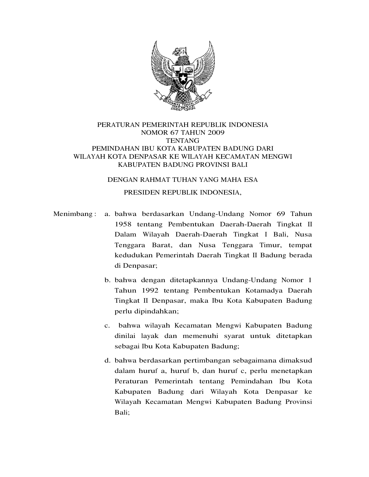 PP Nomor 67 Tahun 2009 | Peraturan Pemerintah Nomor 67 Tahun 2009 tentang PEMINDAHAN IBUKOTA KABUPATEN BADUNG DARI WILAYAH KOTA DENPASAR KE WILAYAH KECAMATAN MENGWI KABUPATEN BADUNG PROVINSI BALI
