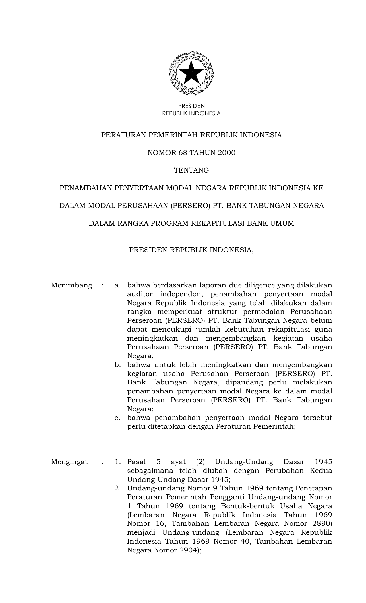 PP Nomor 68 Tahun 2000 | Peraturan Pemerintah Nomor 68 Tahun 2000 tentang PENAMBAHAN PENYERTAAN MODAL NEGARA RI KE DALAM MODAL SAHAM PERUSAHAAN PERSEROAN (PERSERO) PT BANK TABUNGAN NEGARA DALAM RANGKA PROGRAM REKAPITALISASI BANK UMUM