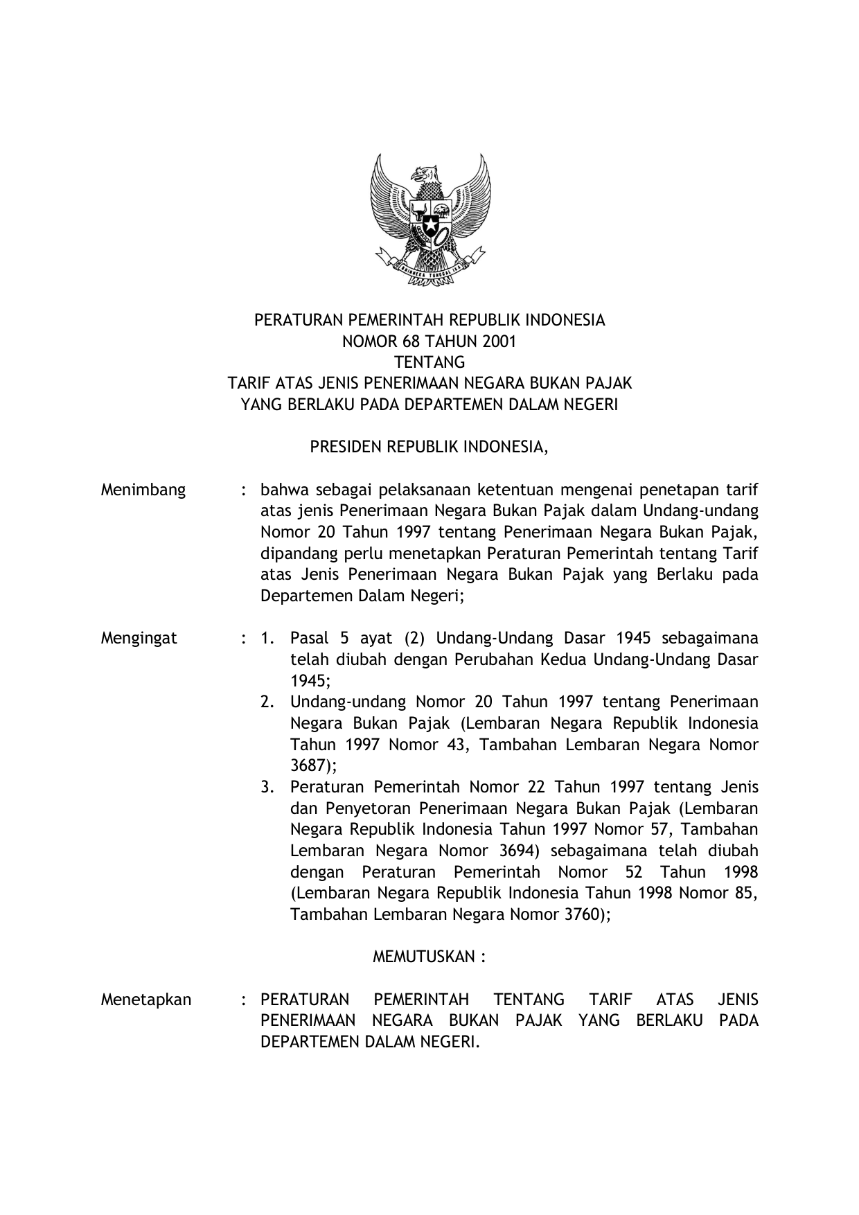 PP Nomor 68 Tahun 2001 | Peraturan Pemerintah Nomor 68 Tahun 2001 tentang TARIF ATAS JENIS PENERIMAAN NEGARA BUKAN PAJAK YANG BERLAKU PADA DEPARTEMEN DALAM NEGERI