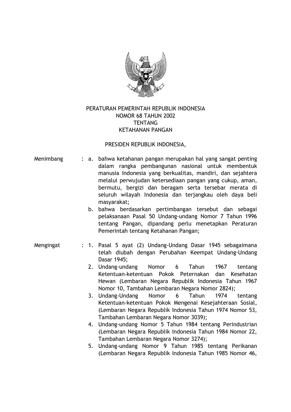 PP Nomor 68 Tahun 2002 | Peraturan Pemerintah Nomor 68 Tahun 2002 tentang KETAHANAN PANGAN