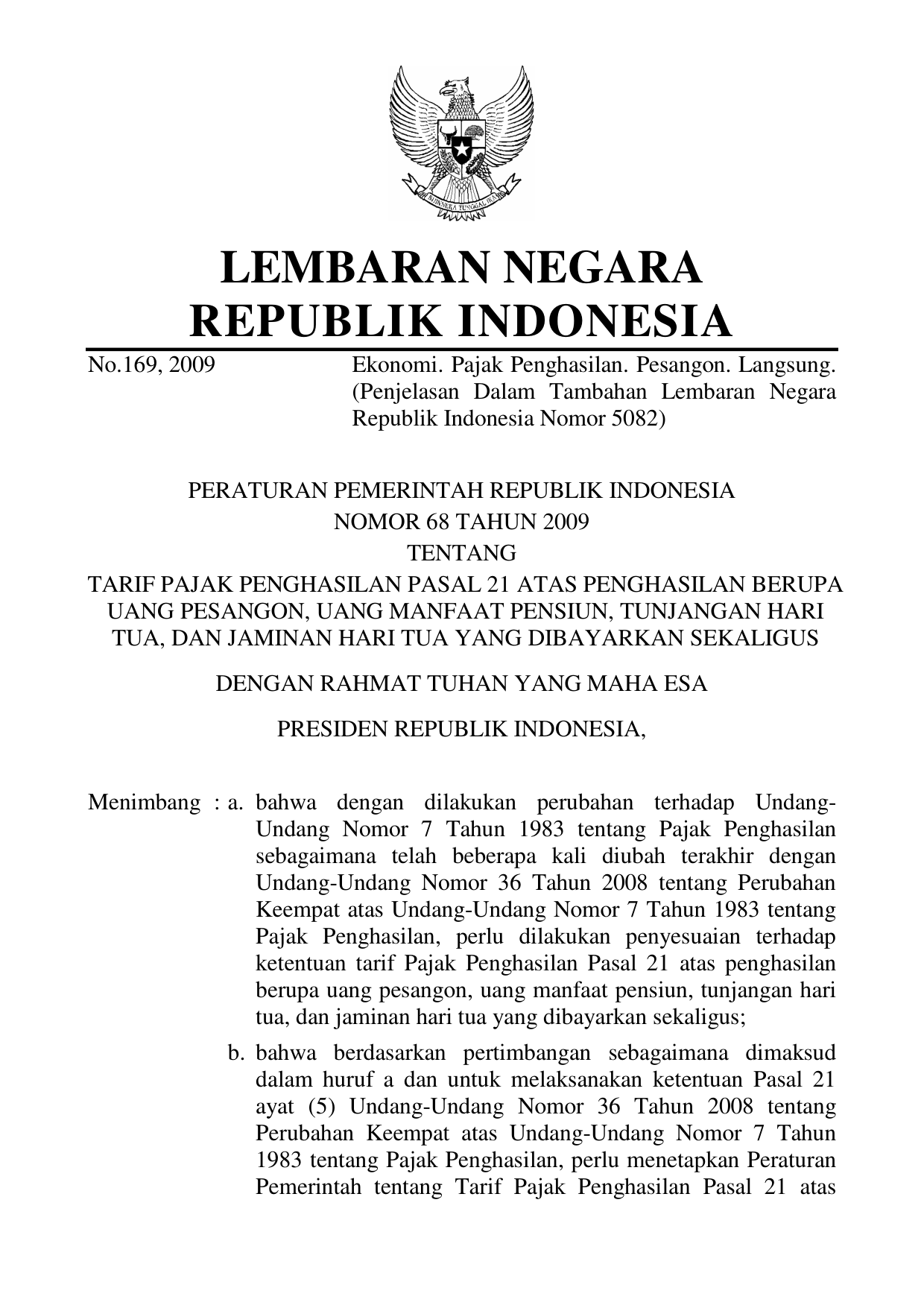 PP Nomor 68 Tahun 2009 | Peraturan Pemerintah Nomor 68 Tahun 2009 tentang TARIF PAJAK PENGHASILAN PASAL 21 ATAS PENGHASILAN BERUPA UANG PESANGON, UANG MANFAAT PENSIUN, TUNJANGAN HARI TUA, DAN JAMINAN HARI TUA YANG DIBAYARKAN SEKALIGUS
