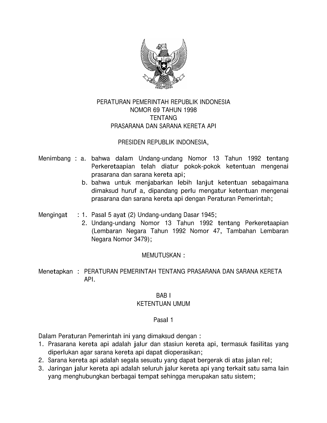 PP Nomor 69 Tahun 1998 | Peraturan Pemerintah Nomor 69 Tahun 1998 tentang PRASARANA DAN SARANA KERETA API