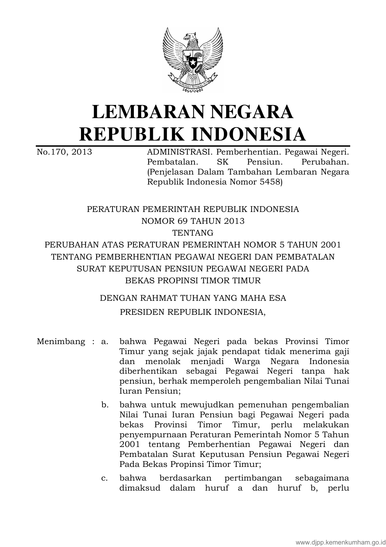 PP Nomor 69 Tahun 2013 | Peraturan Pemerintah Nomor 69 Tahun 2013 tentang PERUBAHAN ATAS PERATURAN PEMERINTAH NOMOR 5 TAHUN 2001 TENTANG PEMBERHENTIAN PEGAWAI NEGERI DAN PEMBATALAN SURAT KEPUTUSANPENSIUN PEGAWAI NEGERI PADA BEKAS PROPINSI TIMOR TIMOR