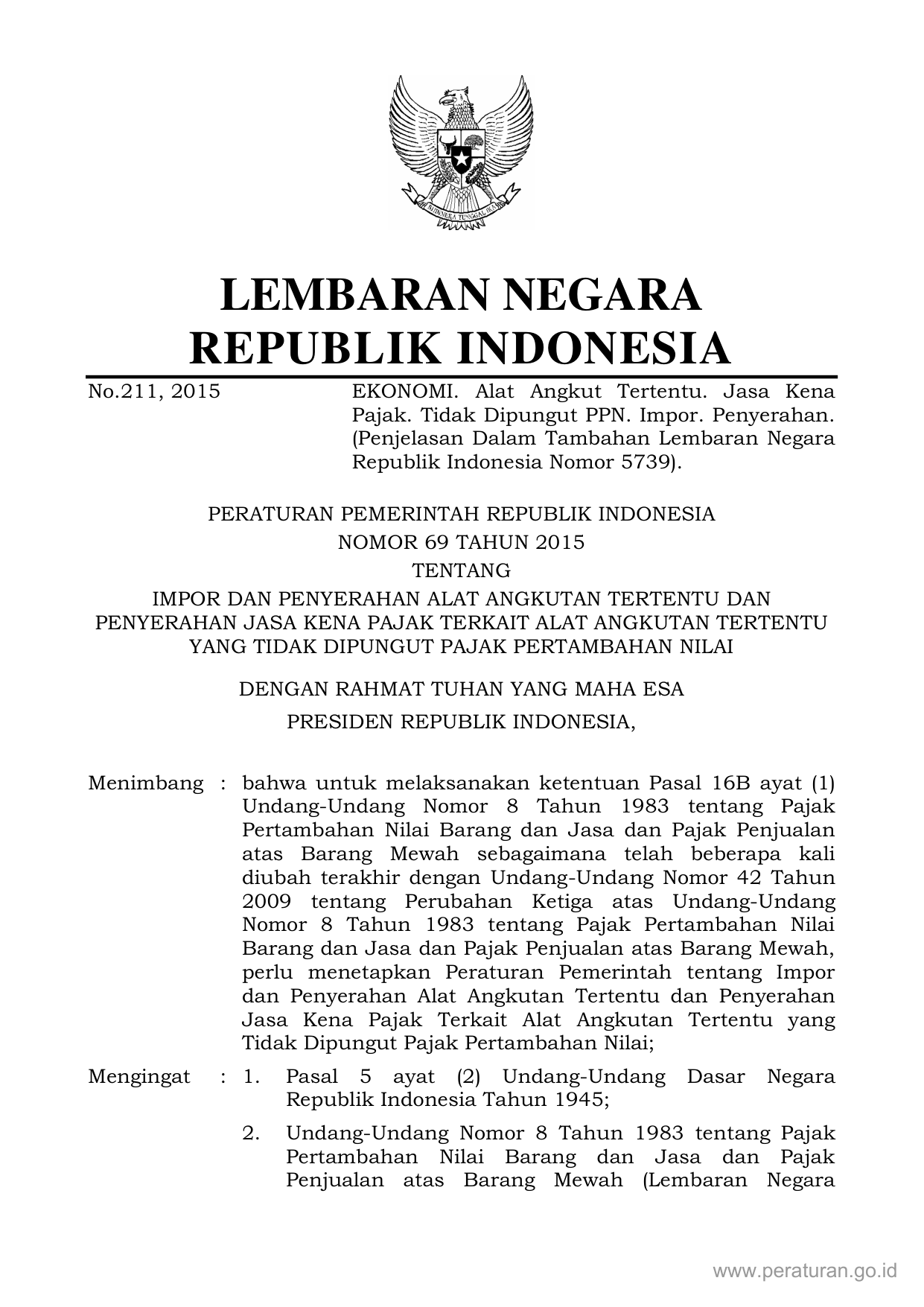 PP Nomor 69 Tahun 2015 | Peraturan Pemerintah Nomor 69 Tahun 2015 tentang IMPOR DAN PENYERAHAN ALAT ANGKUT TERTENTU DAN PENYERAHAN JASA KENA PAJAK TERKAIT ALAT ANGKUT TERTENTU YANG TIDAK DIPUNGUT PAJAK PERTAMBAHAN NILAI