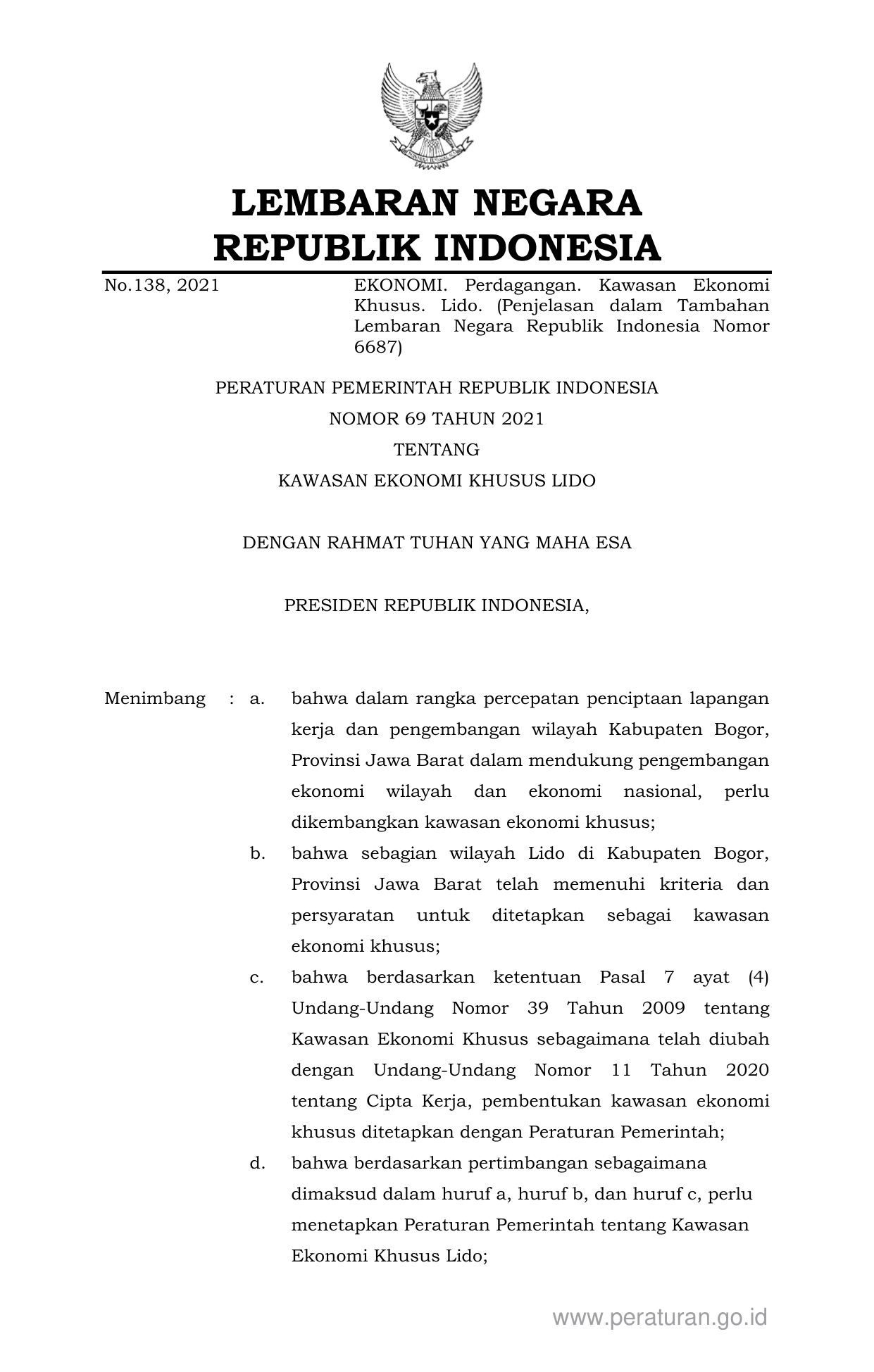 PP Nomor 69 Tahun 2021 | Peraturan Pemerintah Nomor 69 Tahun 2021 tentang KAWASAN EKONOMI KHUSUS LIDO
