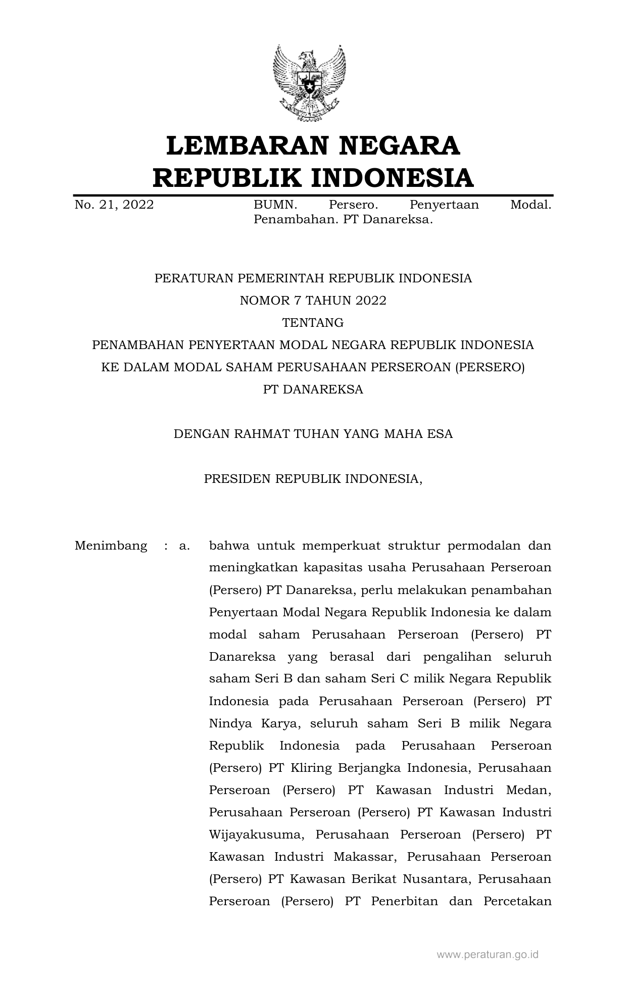PP Nomor 7 Tahun 2022 | Peraturan Pemerintah Nomor 7 Tahun 2022 tentang PENAMBAHAN PENYERTAAN MODAL NEGARA REPUBLIK INDONESIA KE DALAM MODAL SAHAM PERUSAHAAN PERSEROAN (PERSERO) PT DANAREKSA