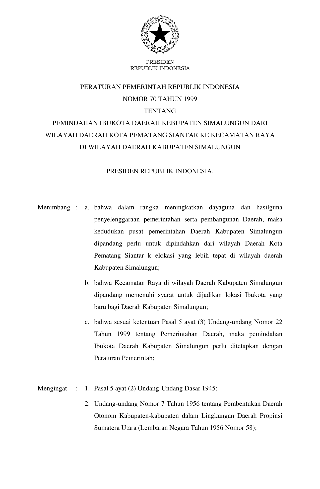 PP Nomor 70 Tahun 1999 | Peraturan Pemerintah Nomor 70 Tahun 1999 tentang PEMINDAHAN IBUKOTA DAERAH KABUPATEN SIMALUNGUN DARI WILAYAH DAERAH KOTA PEMATANG SIANTAR KE KECAMATAN RAYA DI WILAYAH DAERAH KABUPATEN SIMALUNGUN