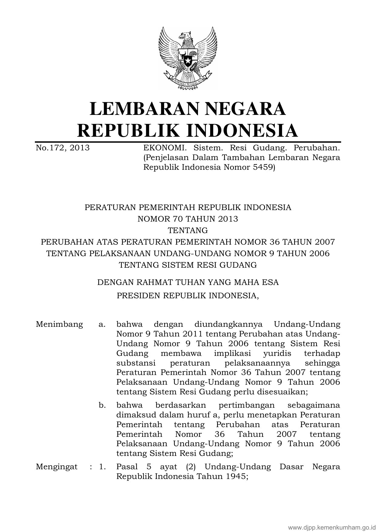 PP Nomor 70 Tahun 2013 | Peraturan Pemerintah Nomor 70 Tahun 2013 tentang PERUBAHAN ATAS PERATURAN PEMERINTAH NOMOR 36 TAHUN 2007 TENTANG PELAKSANAAN UNDANG-UNDANG NOMOR 9 TAHUN 2006 TENTANG SISTEM RESI GUDANG