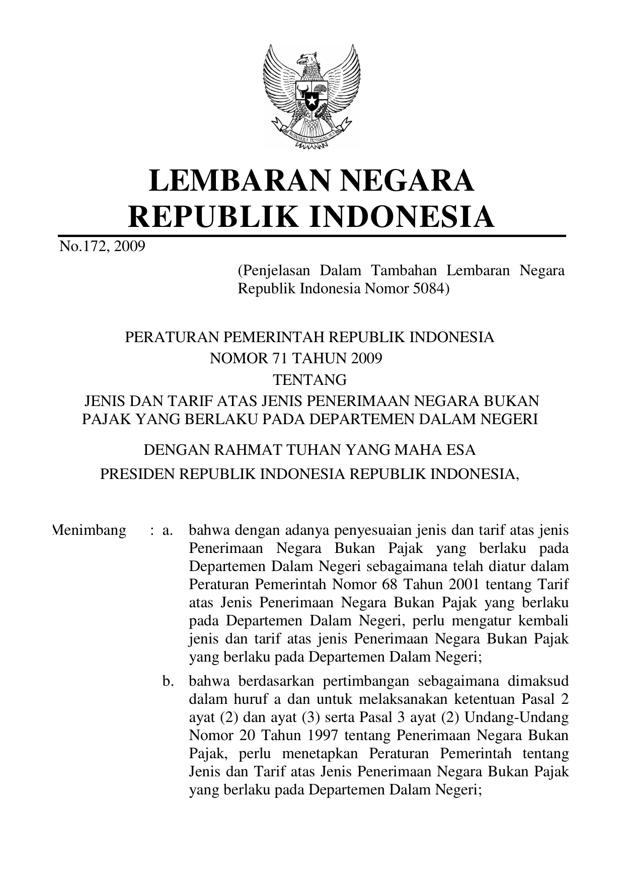 PP Nomor 71 Tahun 2009 | Peraturan Pemerintah Nomor 71 Tahun 2009 tentang JENIS DAN TARIF ATAS JENIS PENERIMAAN NEGARA BUKAN PAJAK YANG BERLAKU PADA DEPARTEMEN DALAM NEGERI