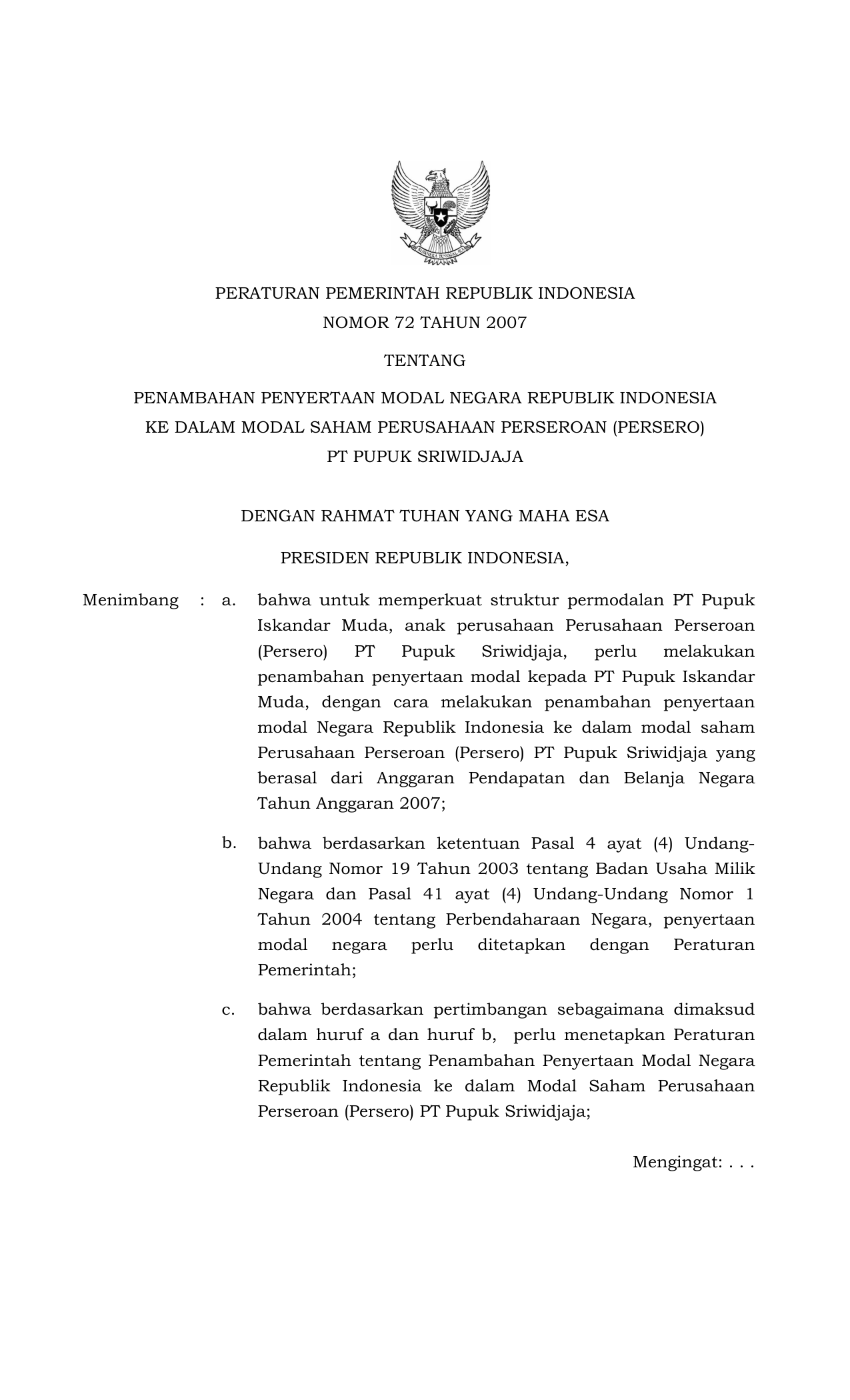 PP Nomor 72 Tahun 2007 | Peraturan Pemerintah Nomor 72 Tahun 2007 tentang PENAMBAHAN PENYERTAAN MODAL NEGARA RI KE DALAM MODAL SAHAM PERUSAHAAN PERSEROAN (PERSERO) PT PUPUK SRIWIJAYA