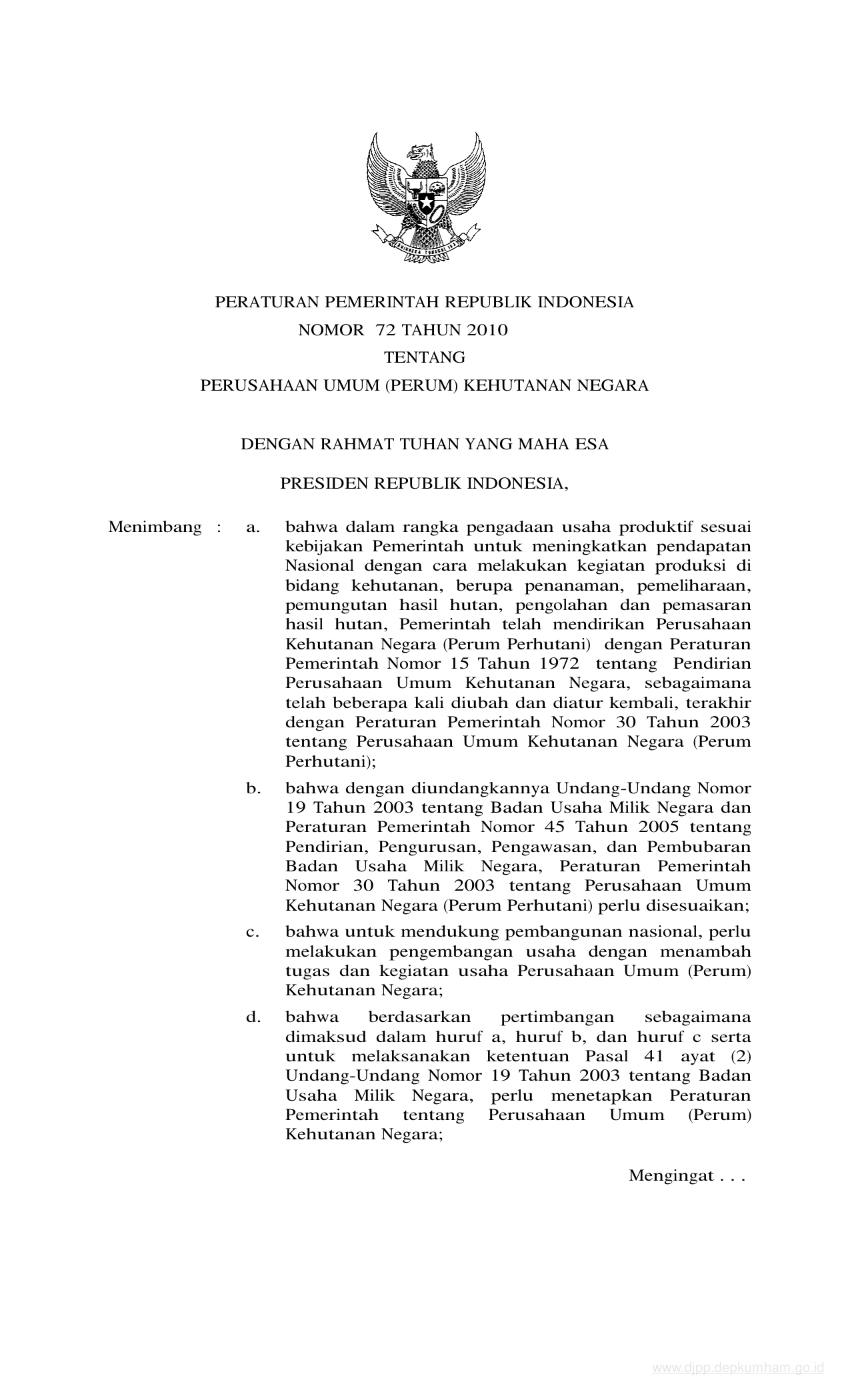 PP Nomor 72 Tahun 2010 | Peraturan Pemerintah Nomor 72 Tahun 2010 tentang PERUSAHAAN UMUM (PERUM) KEHUTANAN NEGARA