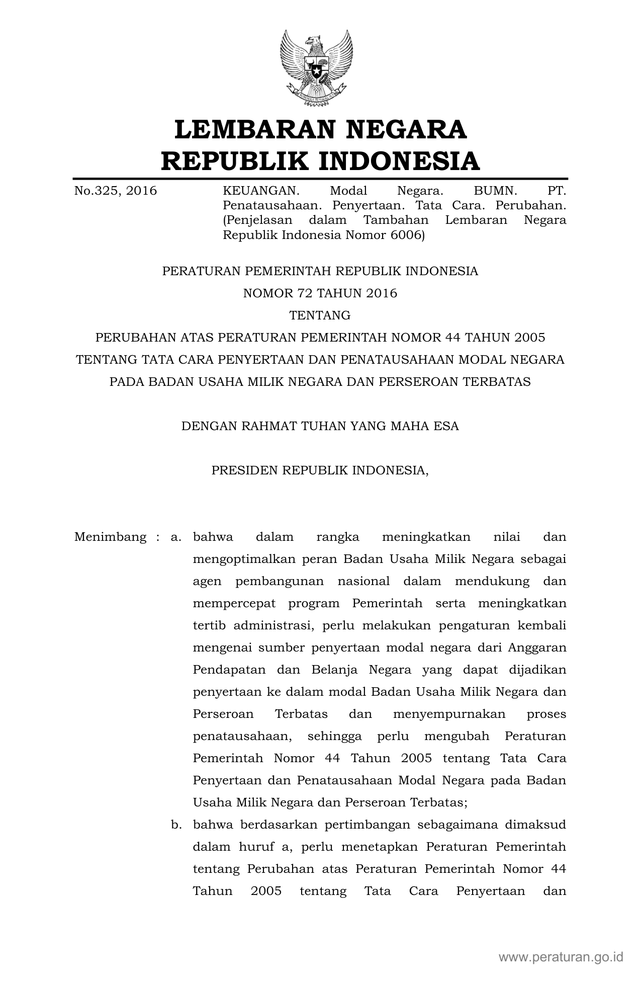 PP Nomor 72 Tahun 2016 | Peraturan Pemerintah Nomor 72 Tahun 2016 tentang Perubahan Atas Peraturan Pemerintah Nomor 44 Tahun 2005 Tentang Tata Cara Penyertaan dan Penatausahaan Modal Negara pada Badan Usaha Milik Negara dan Perseroan Terbatas