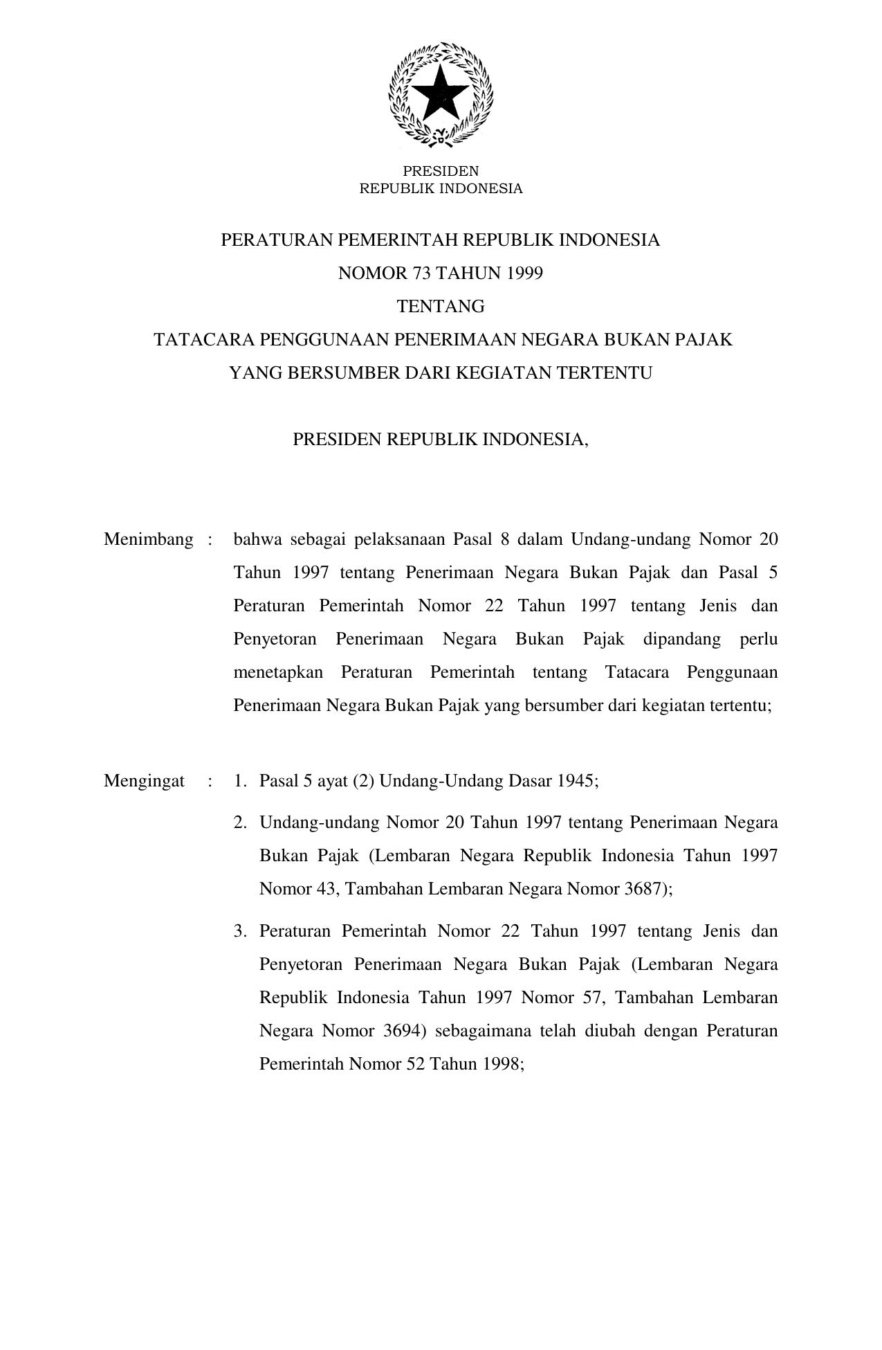 PP Nomor 73 Tahun 1999 | Peraturan Pemerintah Nomor 73 Tahun 1999 tentang TATA CARA PENGGUNAAN PENERIMAAN NEGARA BUKAN PAJAK YANG BERSUMBER DARI KEGIATAN TERTENTU