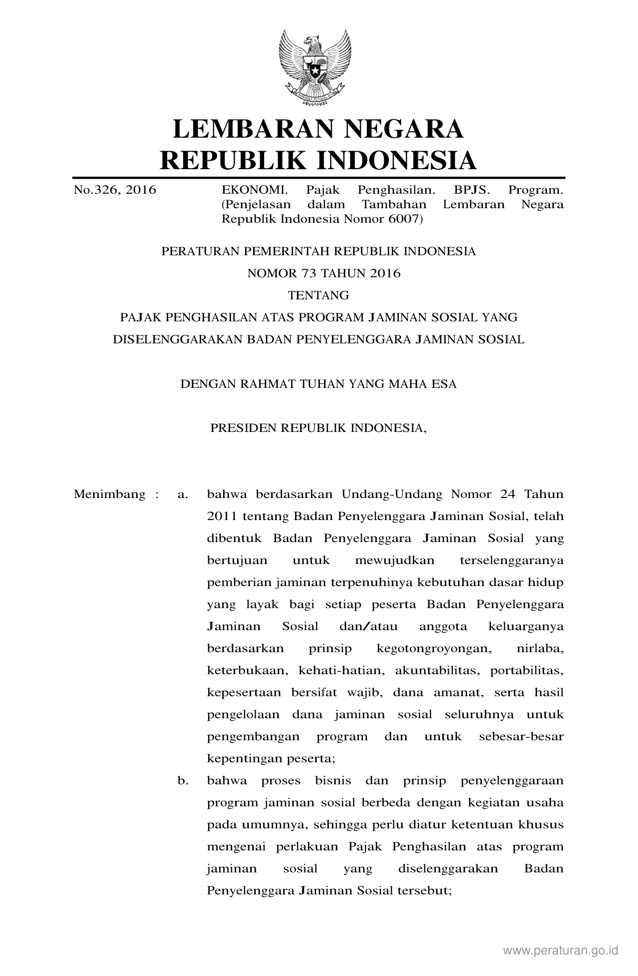 PP Nomor 73 Tahun 2016 | Peraturan Pemerintah Nomor 73 Tahun 2016 tentang Pajak Penghasilan Atas Program Jaminan Sosial Yang Diselenggarakan Badan Penyelenggara Jaminan Sosial