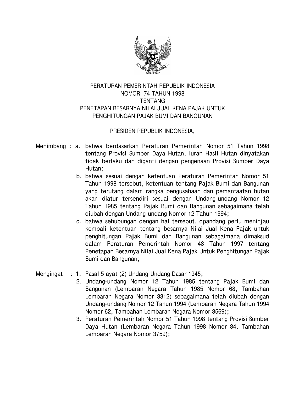 PP Nomor 74 Tahun 1998 | Peraturan Pemerintah Nomor 74 Tahun 1998 tentang PENETAPAN BESARNYA NILAI KENA PAJAK UNTUK PENGHITUNGAN PAJAK BUMI DAN BANGUNAN