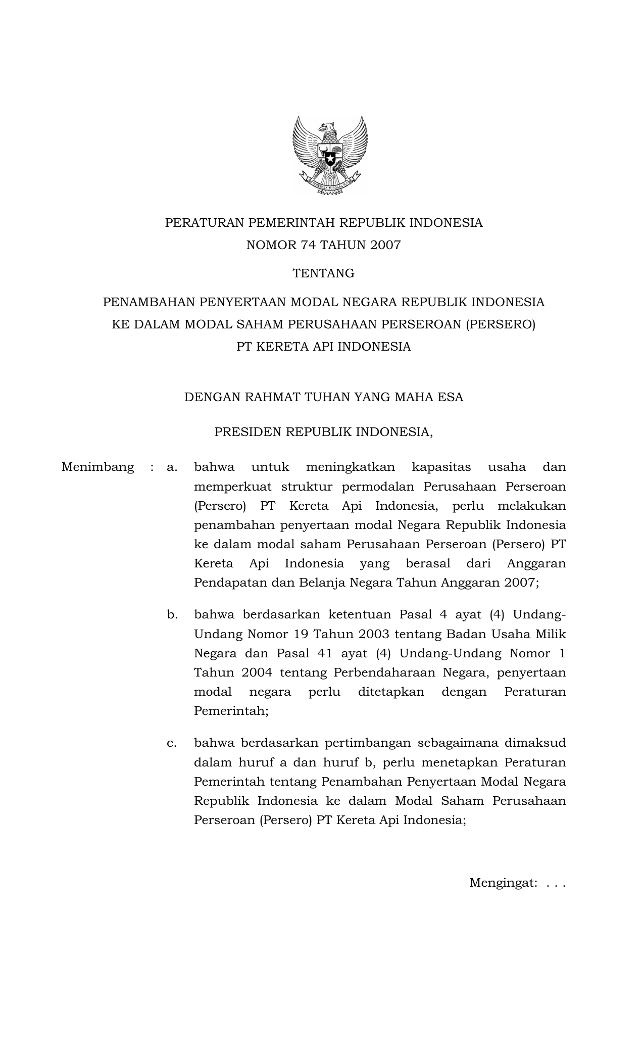 PP Nomor 74 Tahun 2007 | Peraturan Pemerintah Nomor 74 Tahun 2007 tentang PENAMBAHAN PENYERTAAN MODAL NEGARA RI KE DALAM MODAL SAHAM PERUSAHAAN PERSEROAN (PERSERO) PT KERETA API INDONESIA