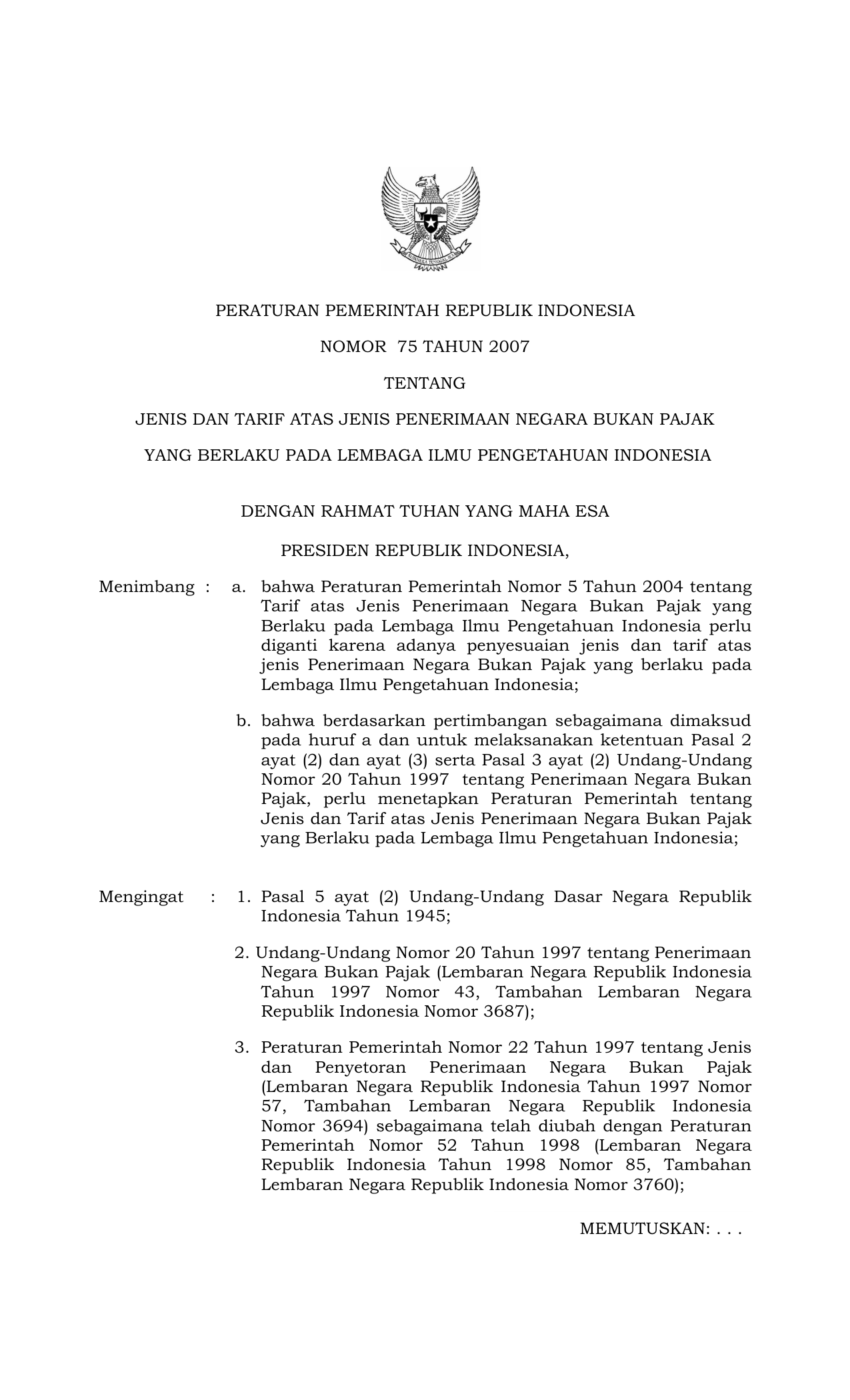 PP Nomor 75 Tahun 2007 | Peraturan Pemerintah Nomor 75 Tahun 2007 tentang JENIS DAN TARIF PENERIMAAN NEGARA BUKAN PAJAK YANG BERLAKU PADA LEMBAGA ILMU PENGETAHUAN INDONESIA