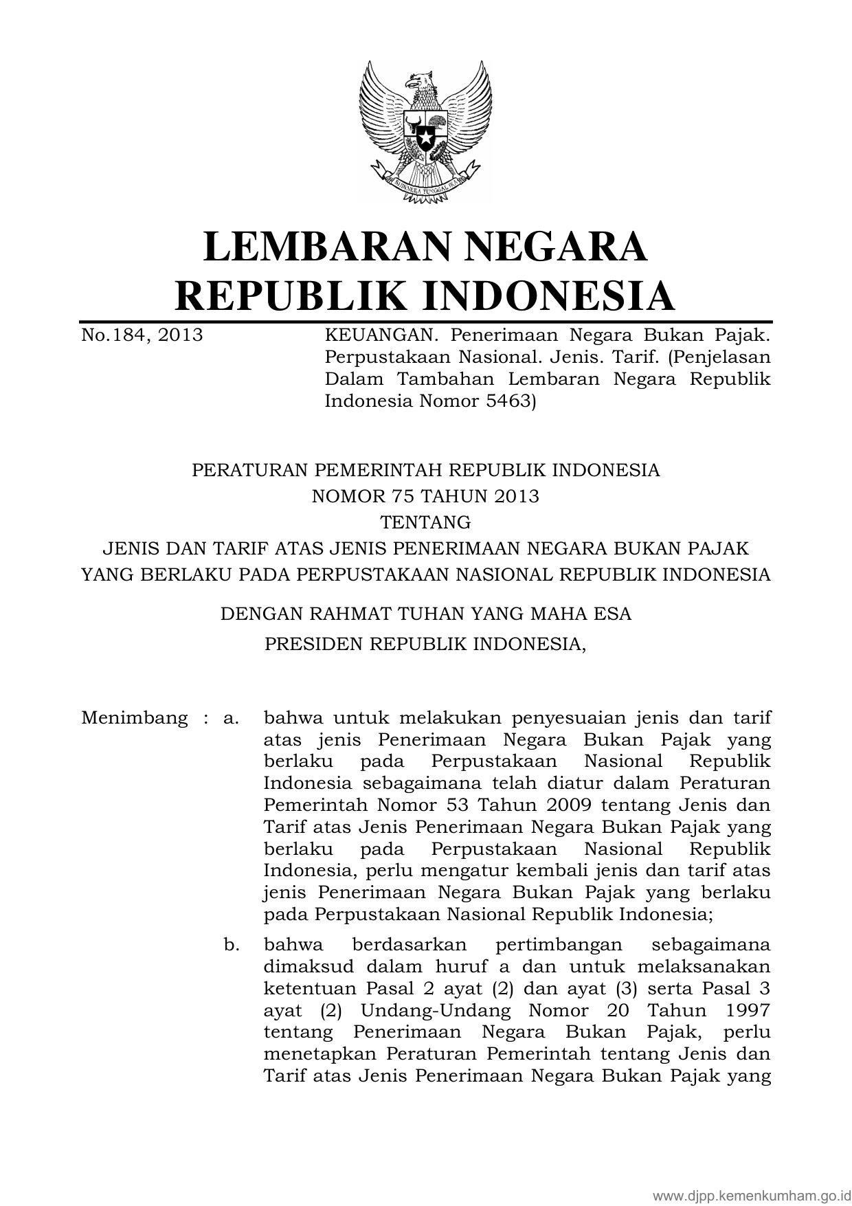 PP Nomor 75 Tahun 2013 | Peraturan Pemerintah Nomor 75 Tahun 2013 tentang JENIS DAN TARIF ATAS JENIS PENERIMAAN NEGARA BUKAN PAJAK YANG BERLAKU PADA PERPUSTAKAAN NASIONAL