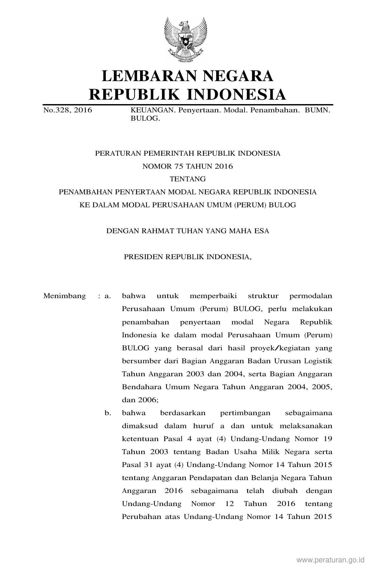 PP Nomor 75 Tahun 2016 | Peraturan Pemerintah Nomor 75 Tahun 2016 tentang Penambahan Penyertaan Modal Negara Republik Indonesia Ke Dalam Modal Perusahaan Umum (Perum) Bulog