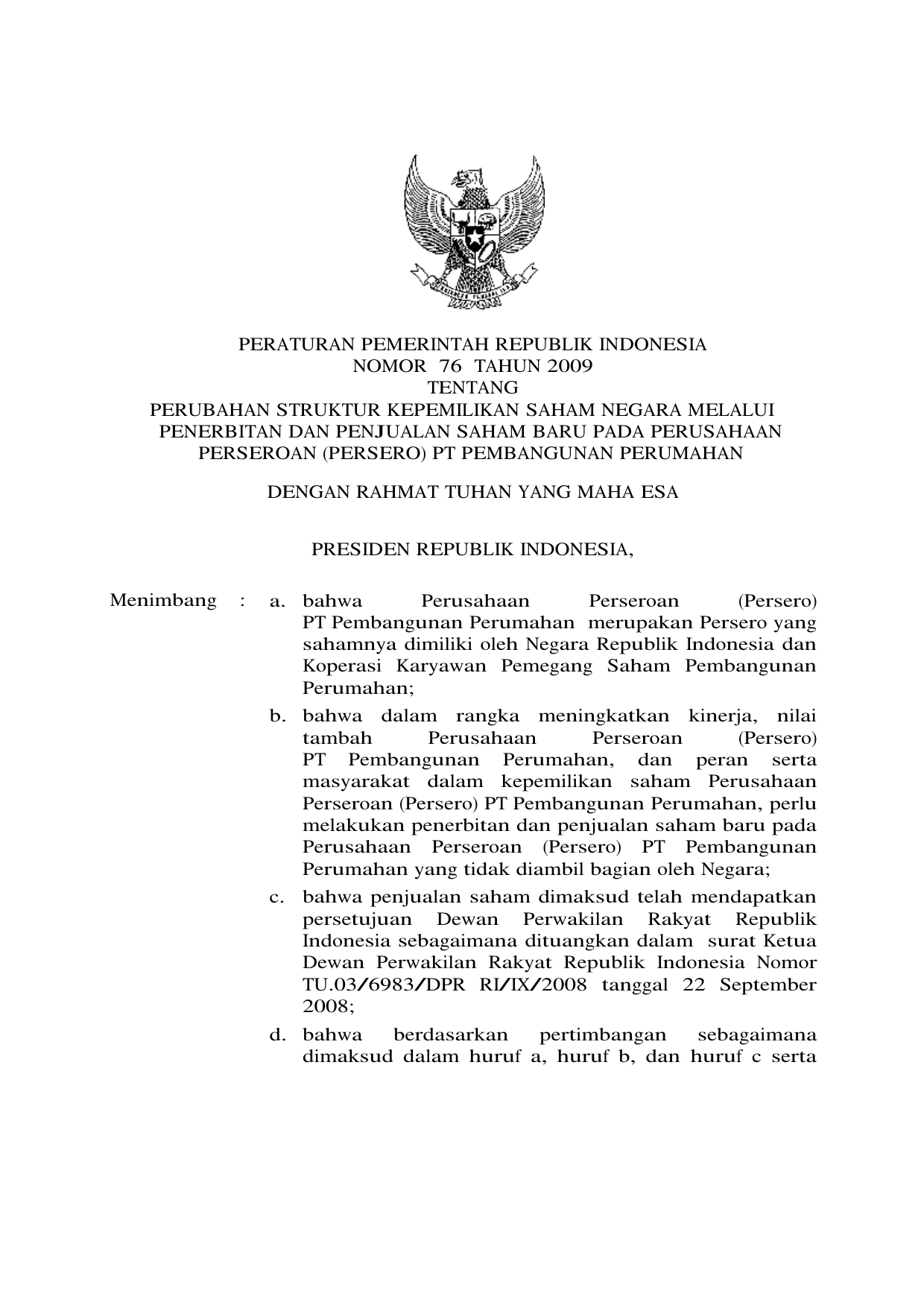 PP Nomor 76 Tahun 2009 | Peraturan Pemerintah Nomor 76 Tahun 2009 tentang PERUBAHAN STRUKTUR KEPEMILIKAN SAHAM NEGARA MELALUI PENERBITAN DAN PENJUALAN SAHAM BARU PADA PERUSAHAAN PERSEROAN (PERSERO) PT PEMBANGUNAN PERUMAHAN
