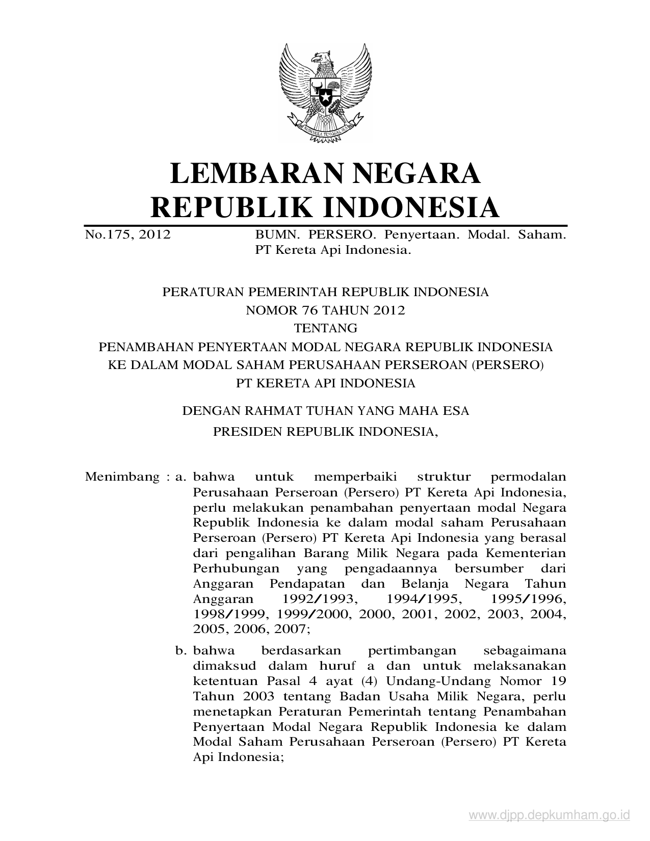 PP Nomor 76 Tahun 2012 | Peraturan Pemerintah Nomor 76 Tahun 2012 tentang PENAMBAHAN PENYERTAAN MODAL NEGARA REPUBLIK INDONESIA KE DALAM MODAL SAHAM PERUSAHAAN PERSEROAN (PERSERO) PT KERETA API INDONESIA