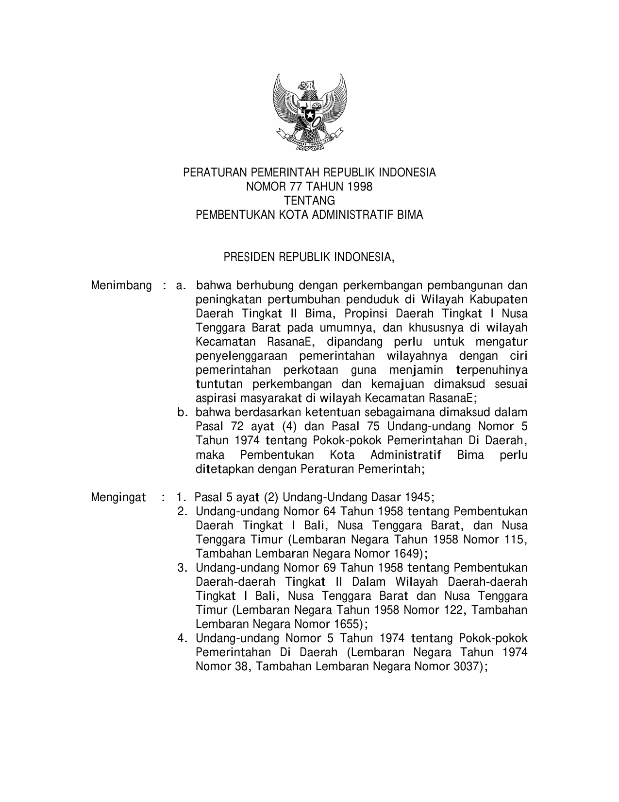 PP Nomor 77 Tahun 1998 | Peraturan Pemerintah Nomor 77 Tahun 1998 tentang PEMBENTUKAN KOTA ADMINISTRATIF BIMA