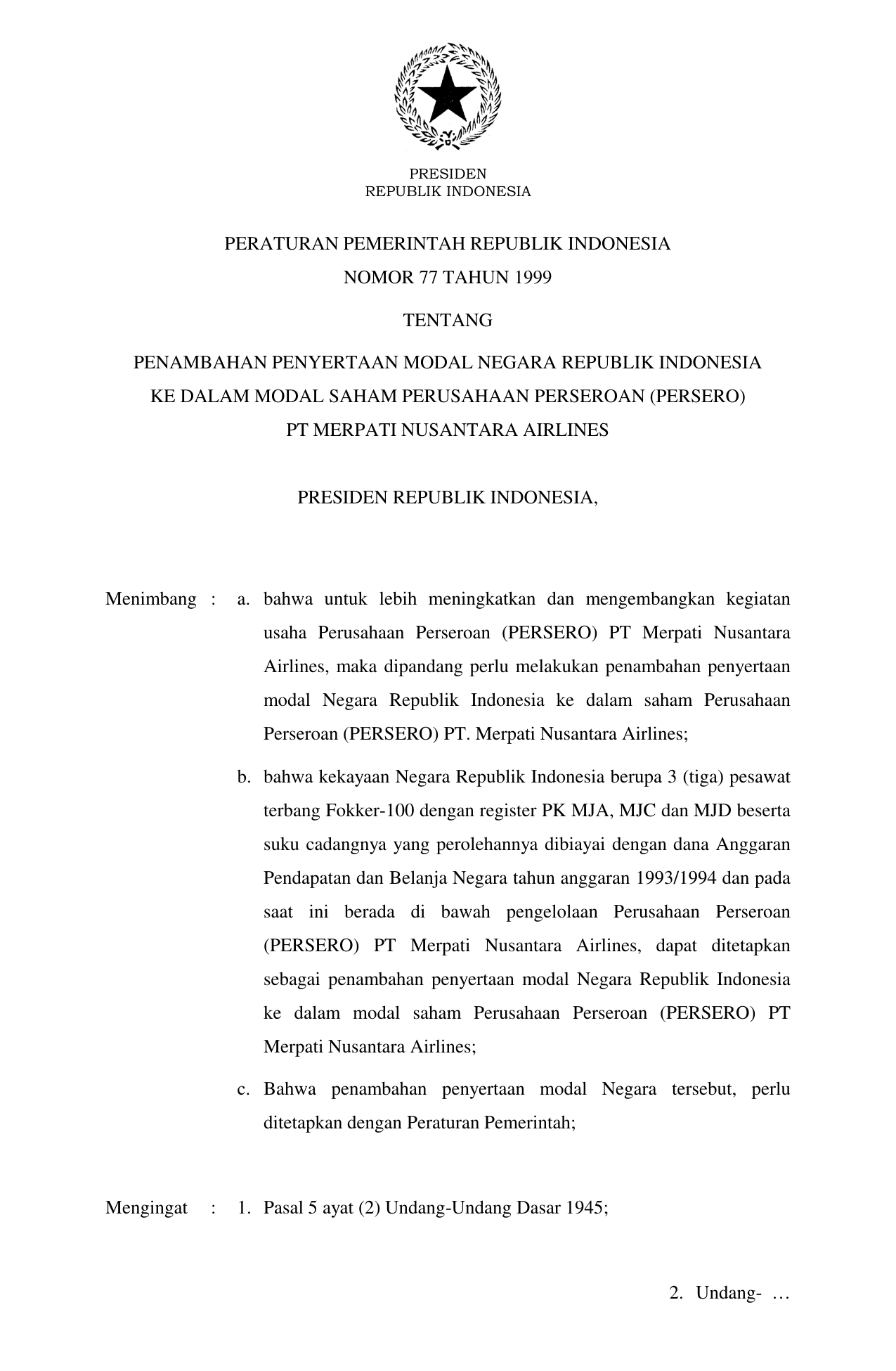 PP Nomor 77 Tahun 1999 | Peraturan Pemerintah Nomor 77 Tahun 1999 tentang PENAMBAHAN PENYERTAAN MODAL NEGARA RI KE DALAM MODAL SAHAM PERUSAHAAN PERSEROAN (PERSERO) PT MERPATI NUSANTARA AIRLINES