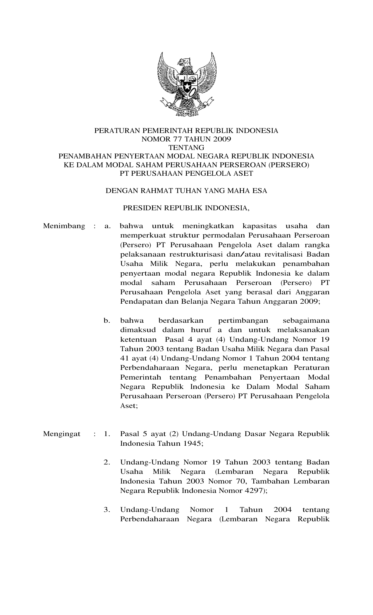 PP Nomor 77 Tahun 2009 | Peraturan Pemerintah Nomor 77 Tahun 2009 tentang PENAMBAHAN PENYERTAAN MODAL NEGARA REPUBLIK INDONESIA KEDALAM MODAL SAHAM PERUSAHAAN PERSEROAN (PERSERO) PT PERUSAHAAN PENGELOLA ASET