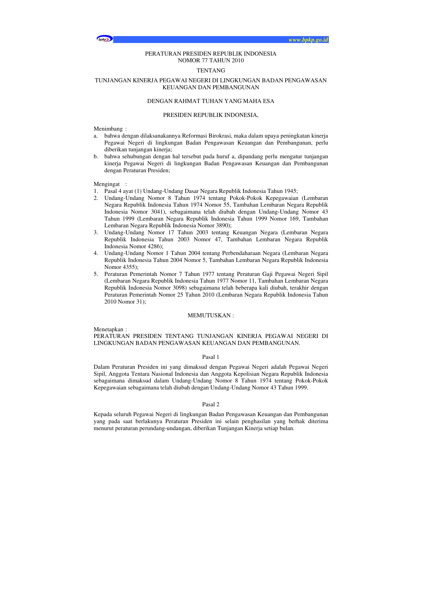 PP Nomor 77 Tahun 2010 | Peraturan Pemerintah Nomor 77 Tahun 2010 tentang TUNJANGAN PENGHASILAN PEJABAT NEGARA