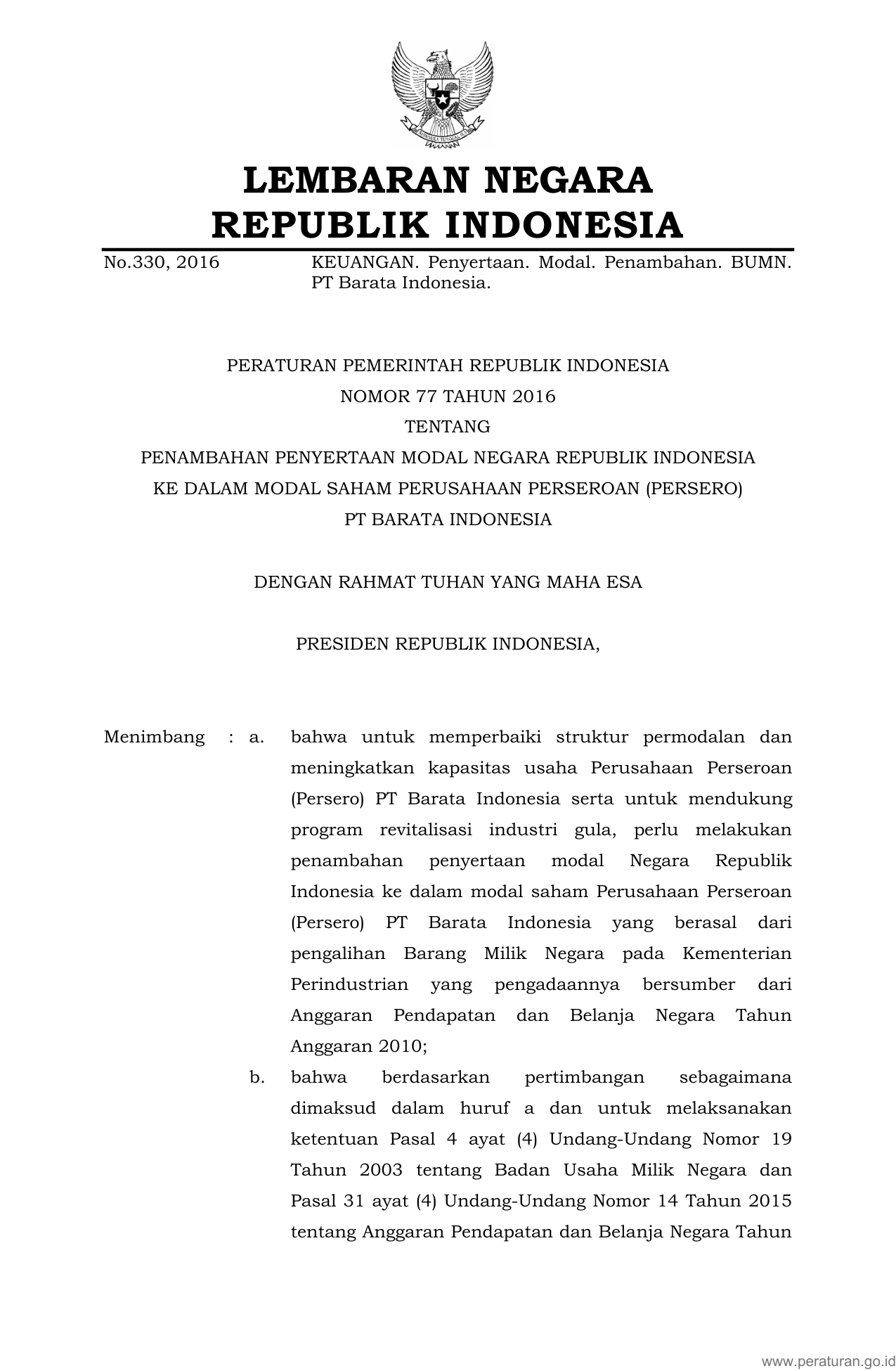 PP Nomor 77 Tahun 2016 | Peraturan Pemerintah Nomor 77 Tahun 2016 tentang Penambahan Penyertaan Modal Negara Republik Indonesia Ke Dalam Modal Saham Perusahaan Perseroan (Persero) PT Barata Indonesia
