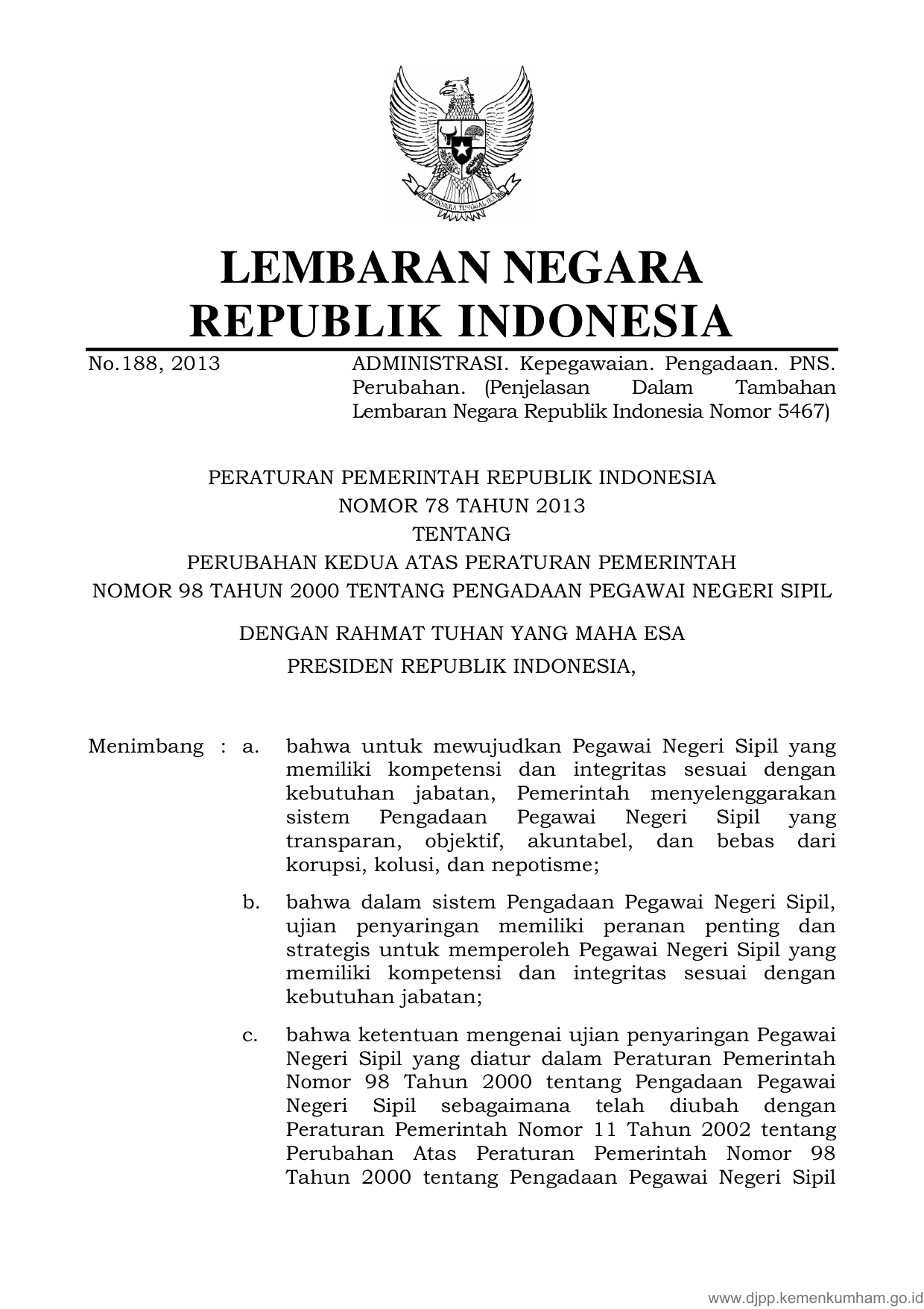 PP Nomor 78 Tahun 2013 | Peraturan Pemerintah Nomor 78 Tahun 2013 tentang PERUBAHAN KEDUA ATAS PERATURAN PEMERINTAH NOMOR 98 TAHUN 2000 TENTANG PENGADAAN PEGAWAI NEGERI SIPIL