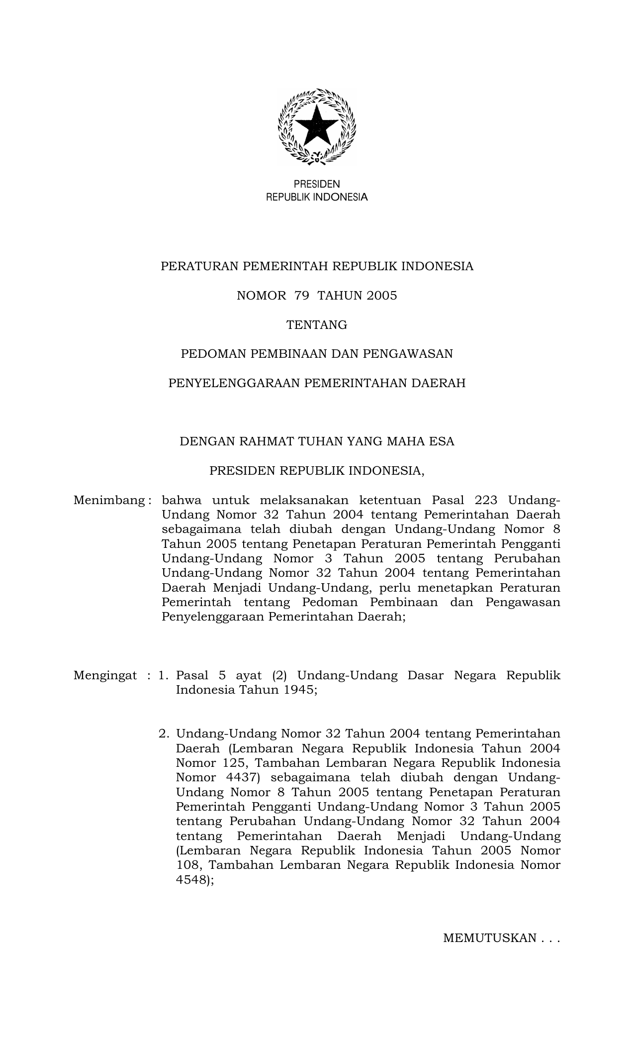 PP Nomor 79 Tahun 2005 | Peraturan Pemerintah Nomor 79 Tahun 2005 tentang PEDOMAN PEMBINAAN DAN PENGAWASAN PENYELENGGARAAN PEMERINTAHAN DAERAH