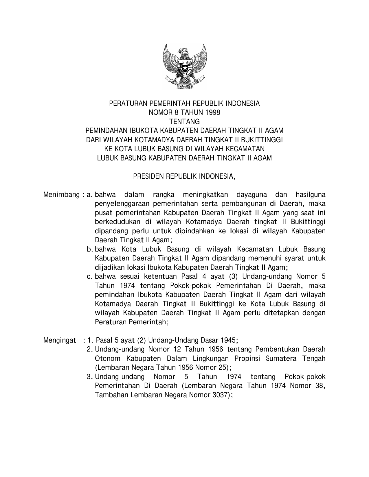 PP Nomor 8 Tahun 1998 | Peraturan Pemerintah Nomor 8 Tahun 1998 tentang PEMINDAHAN IBUKOTA KABUPATEN DAERAH TIK II AGAM DARI WILAYAH KOTAMADYA DAERAH TK II BUKIT TINGGI KE KOTA LUBUK BASUNG KABUPATEN DAERAH TINGKAT II AGAM