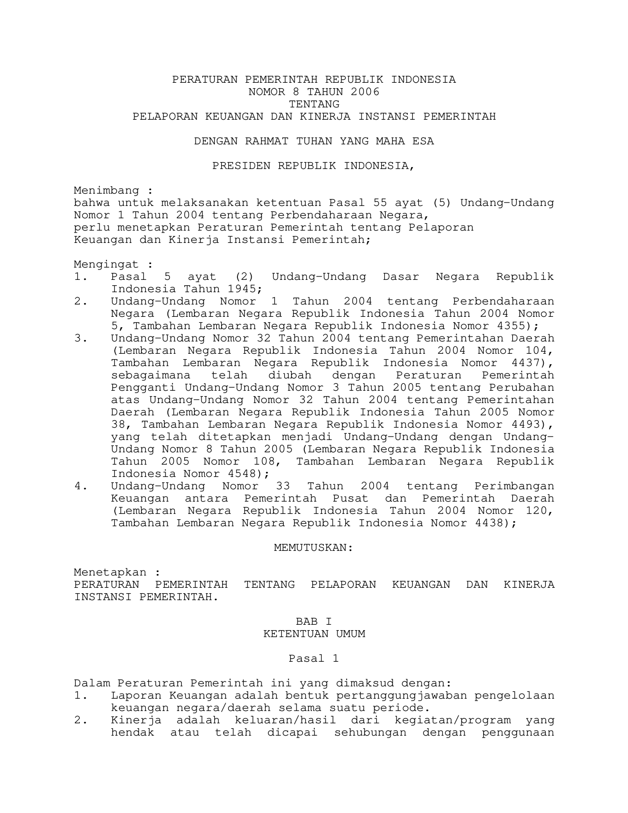 PP Nomor 8 Tahun 2006 | Peraturan Pemerintah Nomor 8 Tahun 2006 tentang PELAPORAN KEUANGAN DAN KINERJA INSTANSI PEMERINTAH