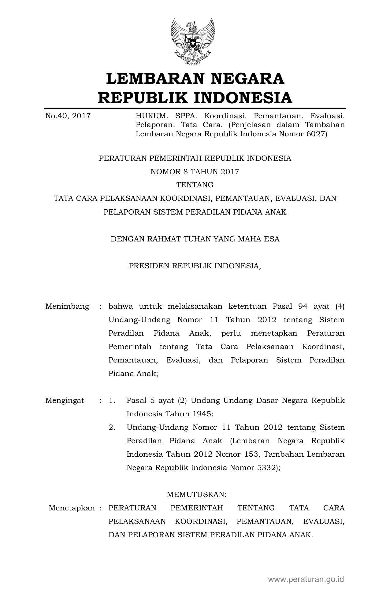 PP Nomor 8 Tahun 2017 | Peraturan Pemerintah Nomor 8 Tahun 2017 tentang Tata Cara Pelaksanaan Koordinasi, Pemantauan, Evaluasi, dan Pelaporan Sistem Peradilan Pidana Anak