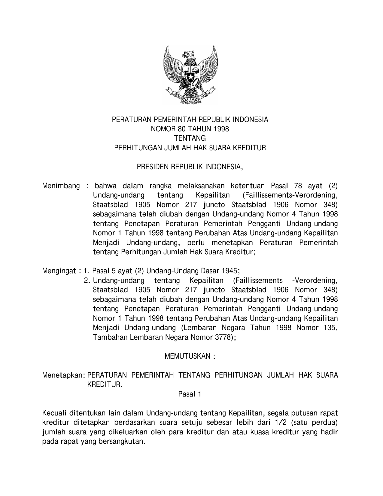 PP Nomor 80 Tahun 1998 | Peraturan Pemerintah Nomor 80 Tahun 1998 tentang PERHITUNGAN JUMLAH HAK SUARA KREDITUR