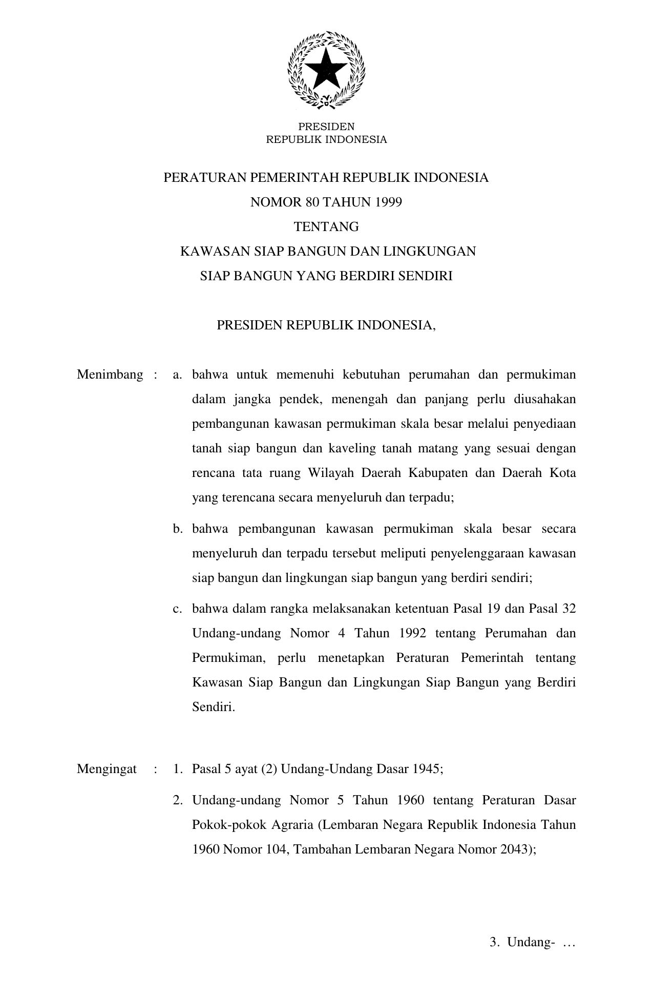 PP Nomor 80 Tahun 1999 | Peraturan Pemerintah Nomor 80 Tahun 1999 tentang KAWASAN SIAP BANGUN DAN LINGKUNGAN SIAP BANGUN YANG BERDIRI SENDIRI