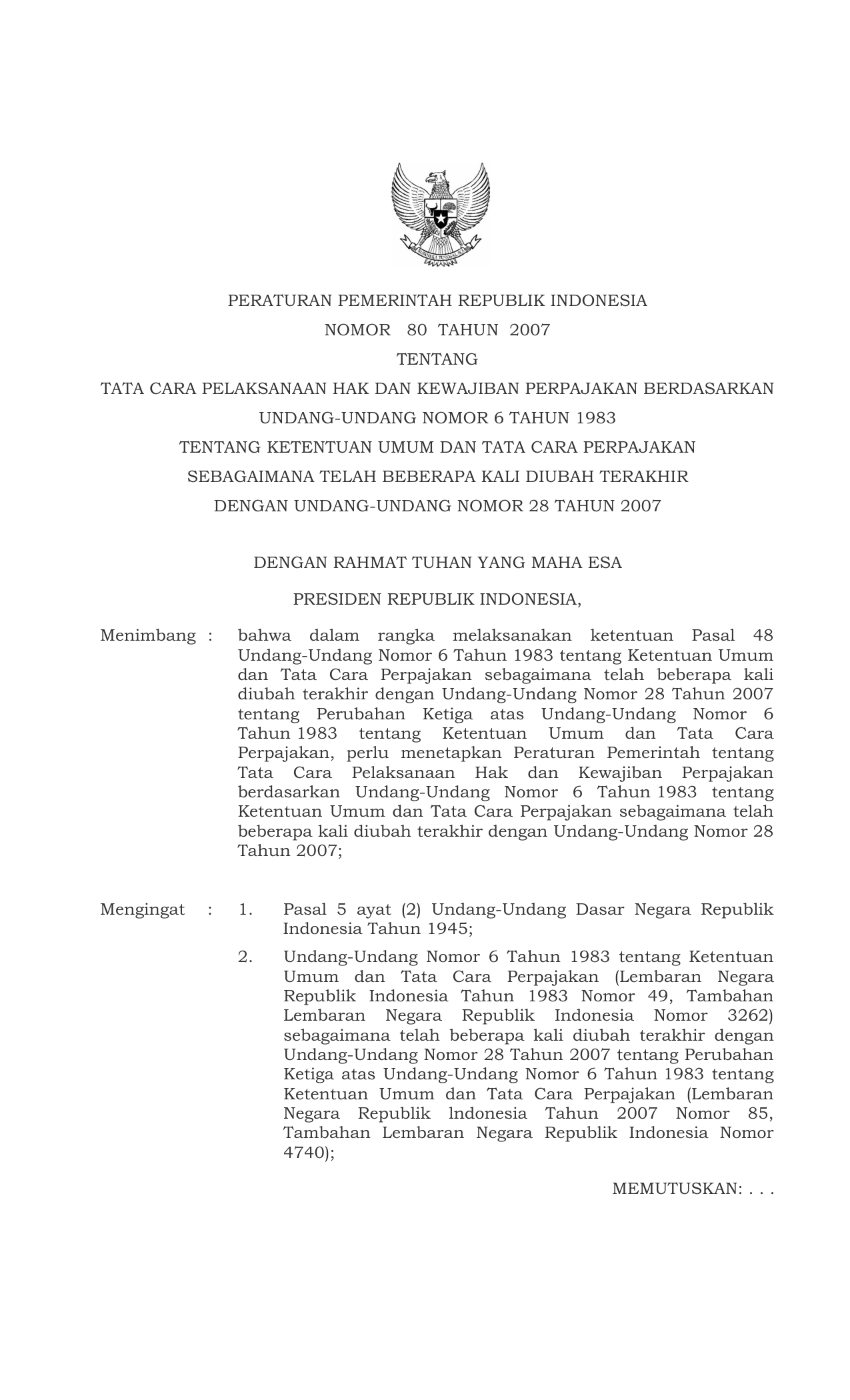 PP Nomor 80 Tahun 2007 | Peraturan Pemerintah Nomor 80 Tahun 2007 tentang TATA CARA PELAKSANAAN HAK DAN KEWAJIBAN PERPAJAKAN BERDASARKAN UU 6-1983 TENTANG KETENTUAN UMUM DAN TATA CARA PERPAJAKAN SEBAGAIMANA TELAH BEBERAPA KALI DIUBAH TERAKHIR DENGAN UU 28-2007