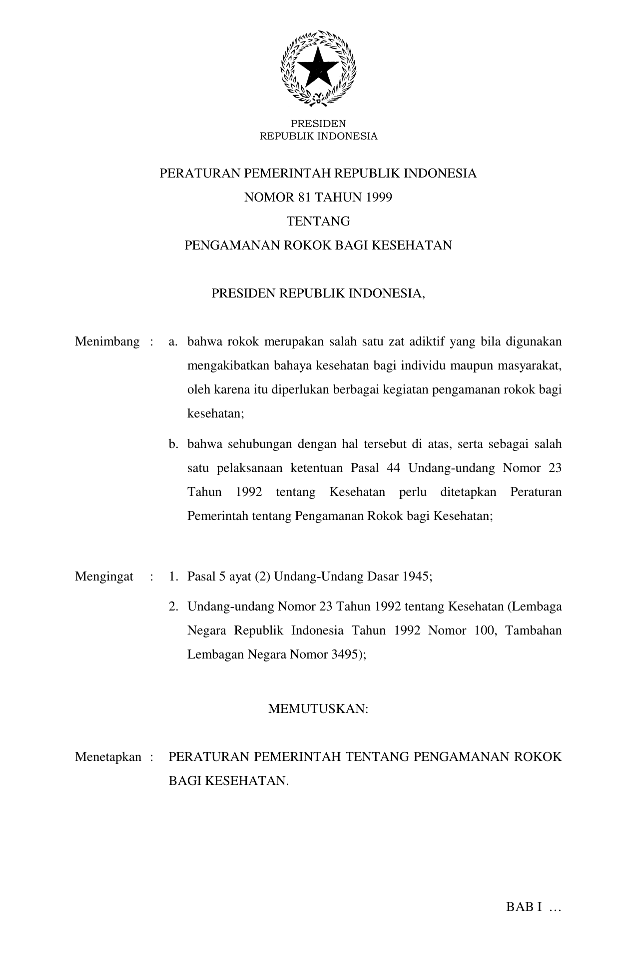 PP Nomor 81 Tahun 1999 | Peraturan Pemerintah Nomor 81 Tahun 1999 tentang PENGAMANAN ROKOK BAGI KESEHATAN