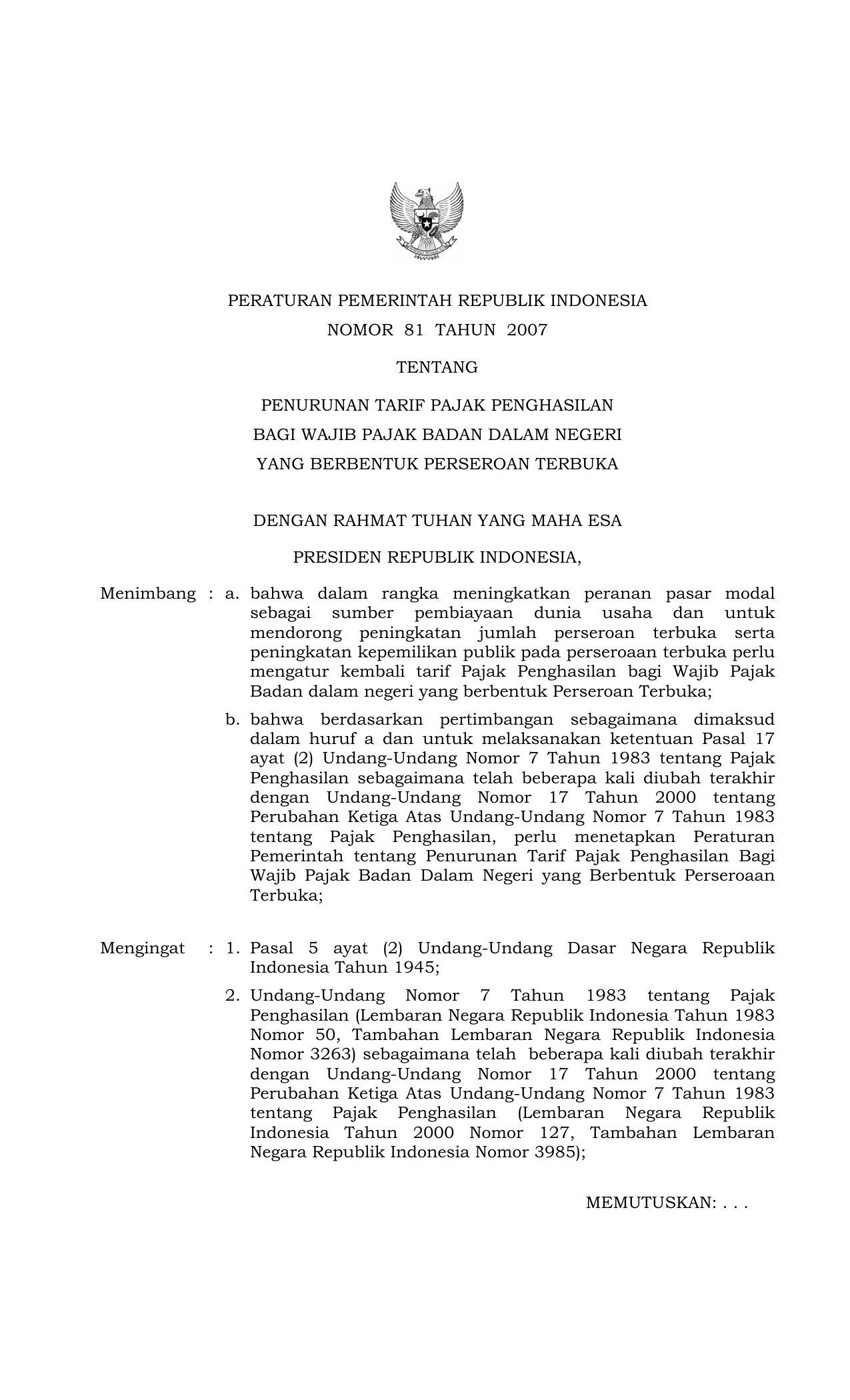 PP Nomor 81 Tahun 2007 | Peraturan Pemerintah Nomor 81 Tahun 2007 tentang PENURUNAN TARIF PAJAK PENGHASILAN BAGI WAJIB PAJAK BADAN DALAM NEGERI YANG BERBENTUK PERSEROAN TERBUKA