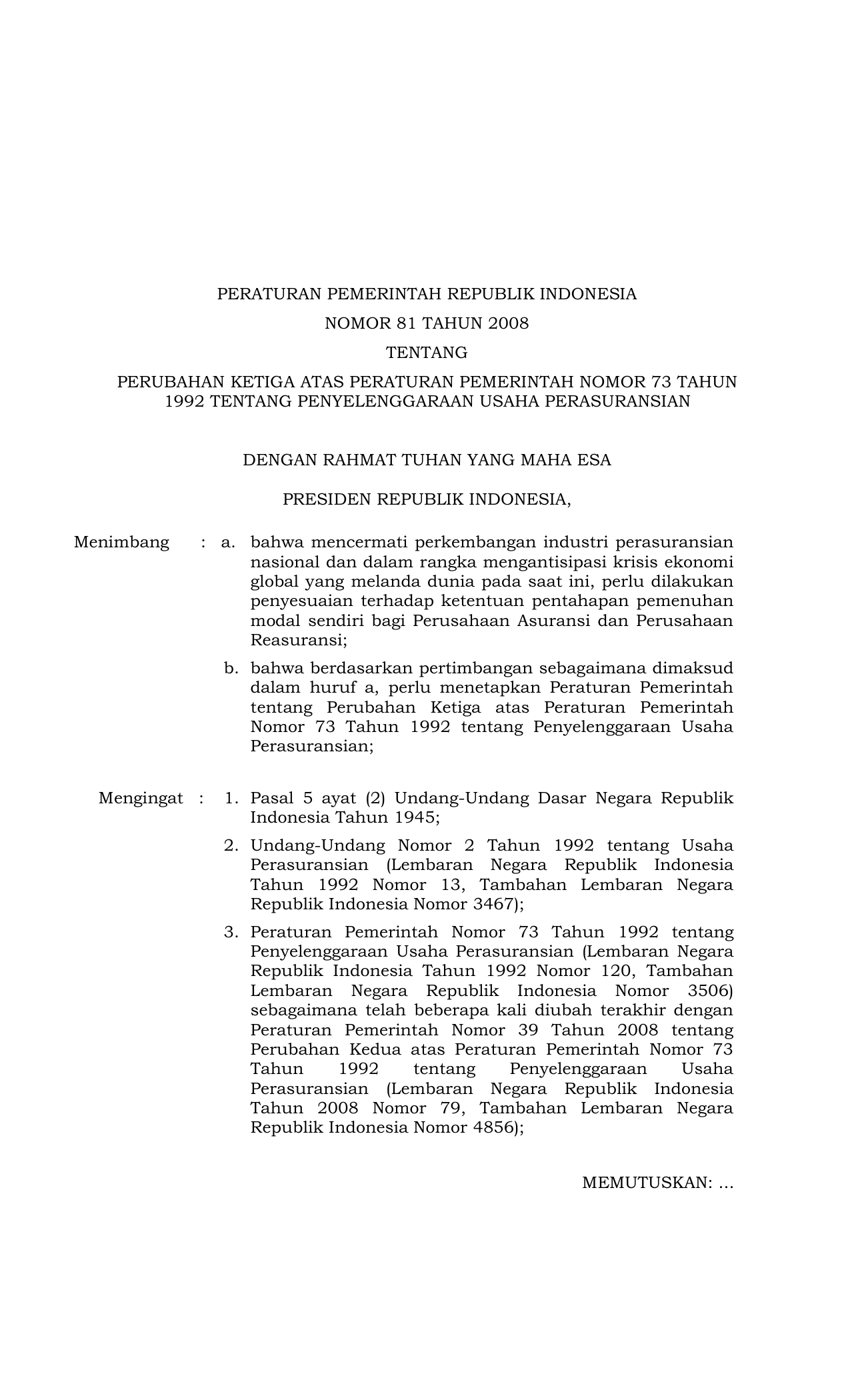 PP Nomor 81 Tahun 2008 | Peraturan Pemerintah Nomor 81 Tahun 2008 tentang PERUBAHAN KETIGA PP 73-1992 TENTANG PENYELENGGARAAN USAHA PERASURANSIAN