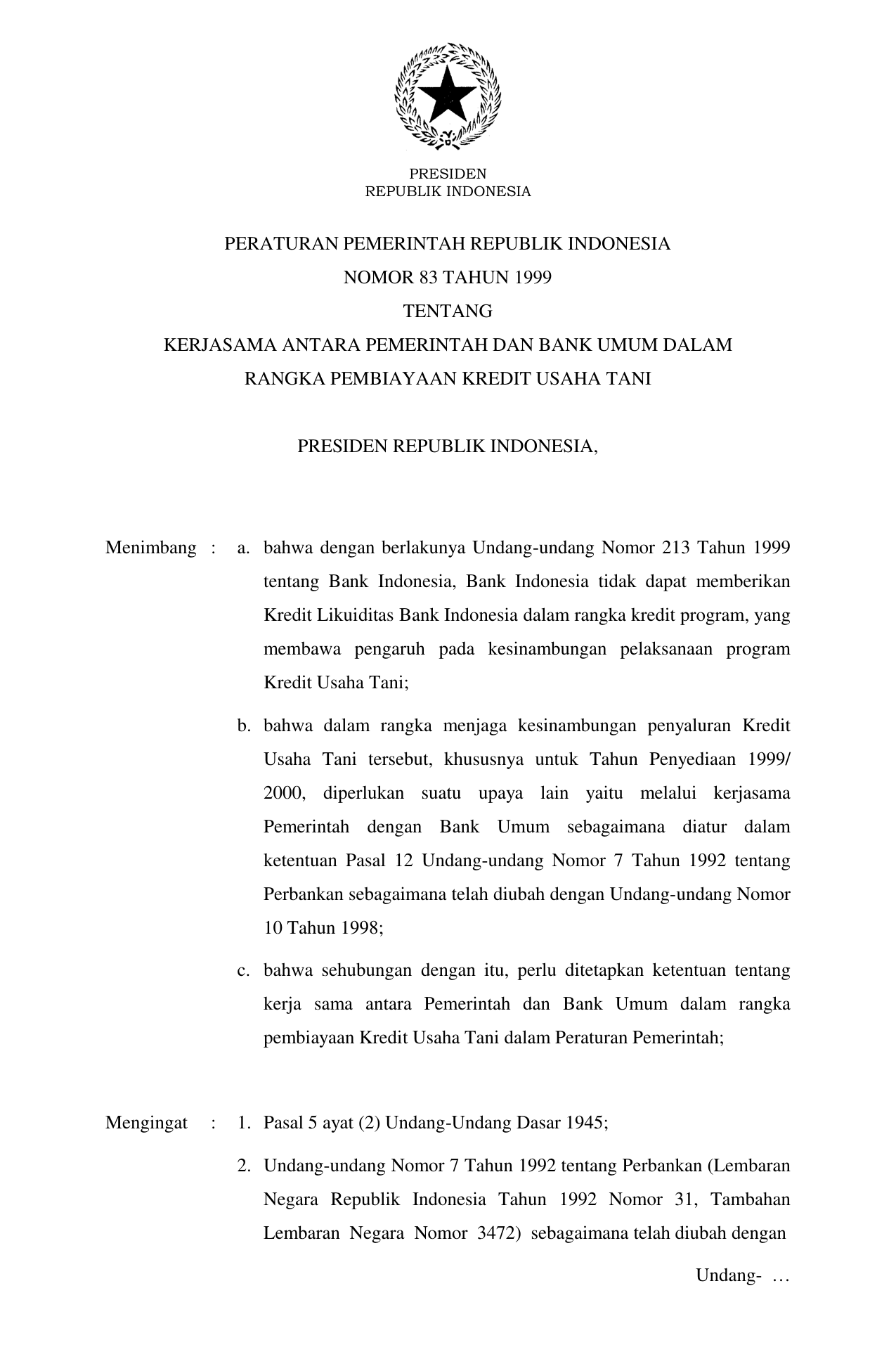 PP Nomor 83 Tahun 1999 | Peraturan Pemerintah Nomor 83 Tahun 1999 tentang KERJASAMA ANTARA PEMERINTAH DAN BANK UMUM DALAM RANGKA PEMBIAYAAN KREDIT USAHA TANI