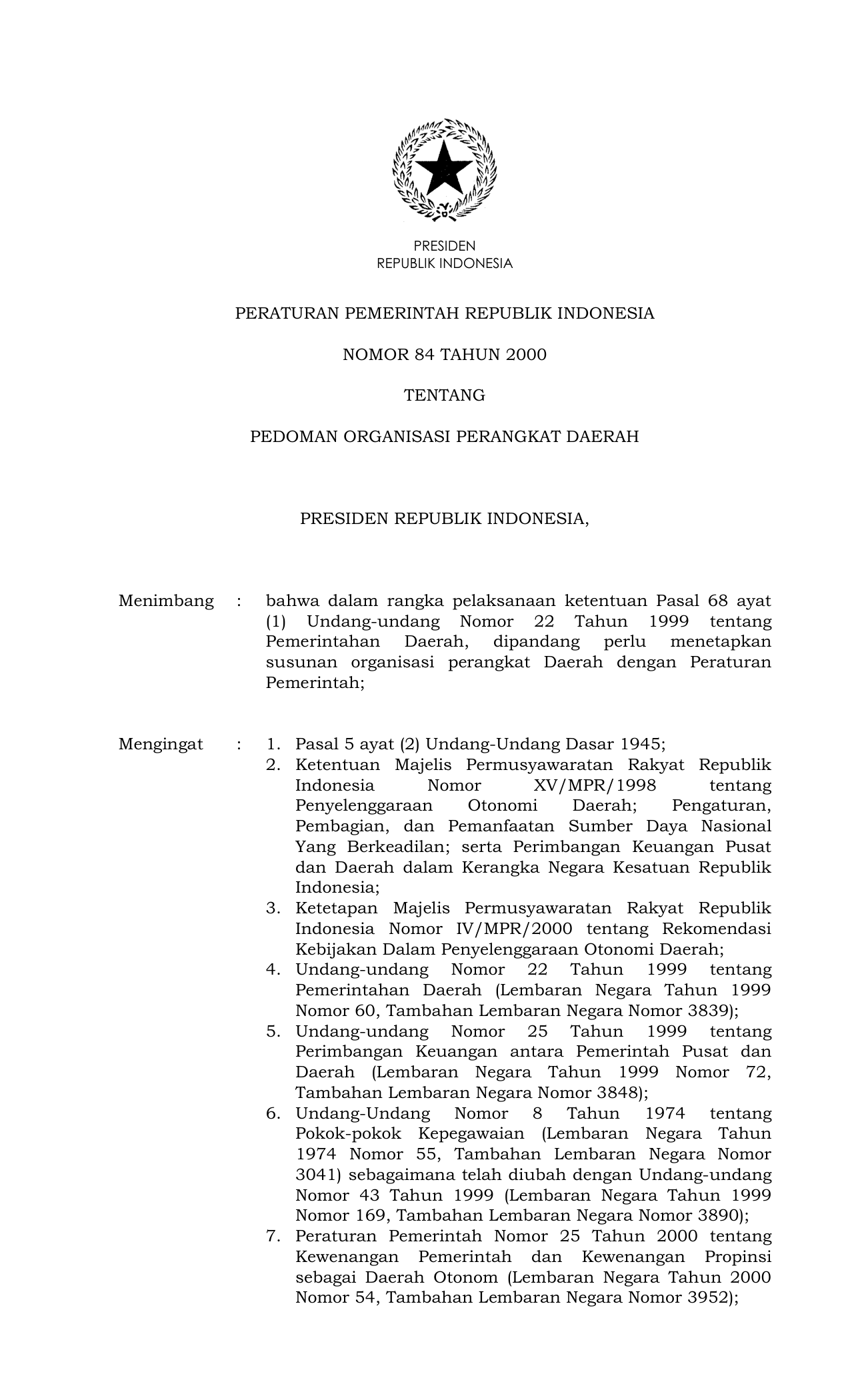 PP Nomor 84 Tahun 2000 | Peraturan Pemerintah Nomor 84 Tahun 2000 tentang PEDOMAN ORGANISASI PERANGKAT DAERAH