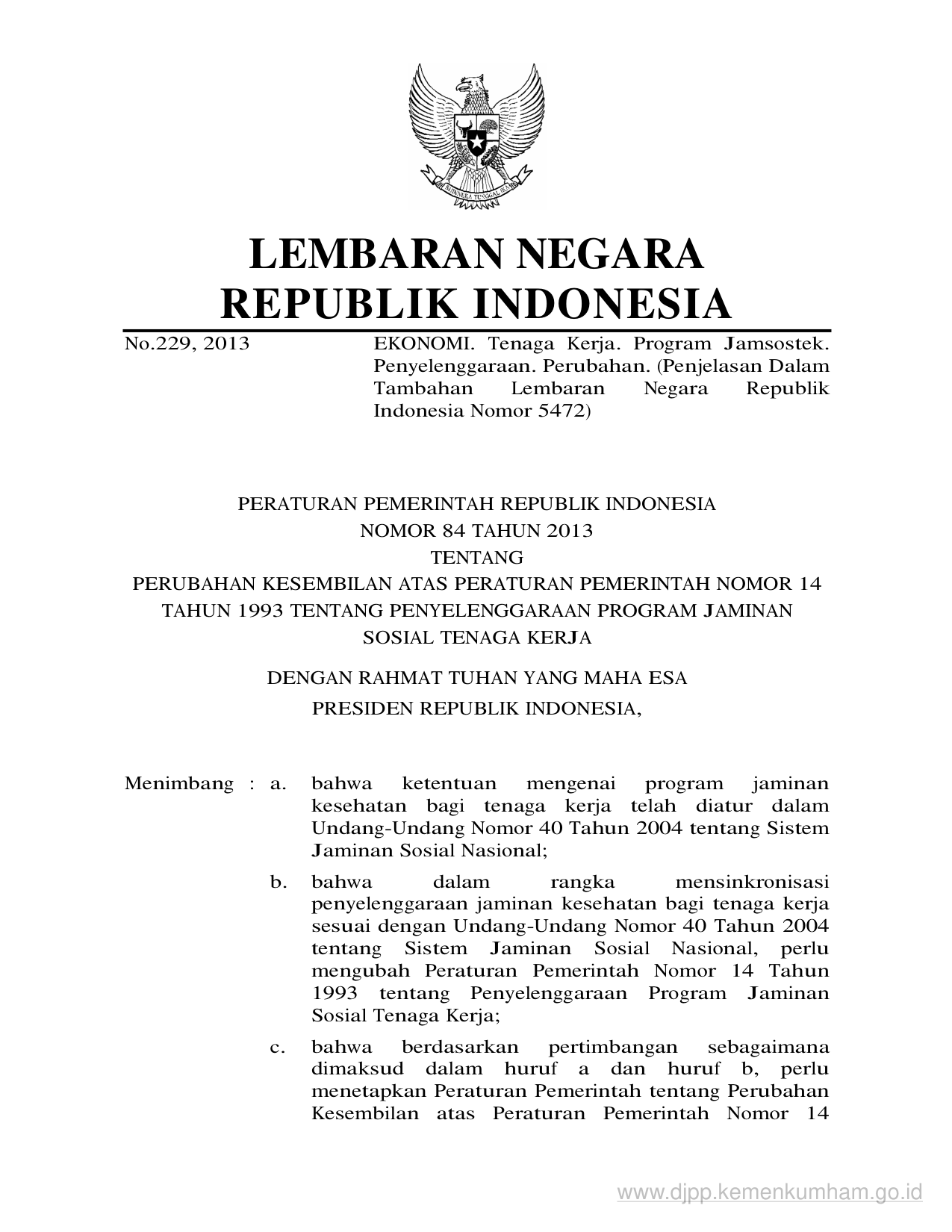 PP Nomor 84 Tahun 2013 | Peraturan Pemerintah Nomor 84 Tahun 2013 tentang PERUBAHAN KESEMBILAN ATAS PERATURAN PEMERINTAH NOMOR 14 TAHUN 1993 TENTANG PENYELENGGARAAN PROGRAM JAMINAN SOSIAL TENAGA KERJA