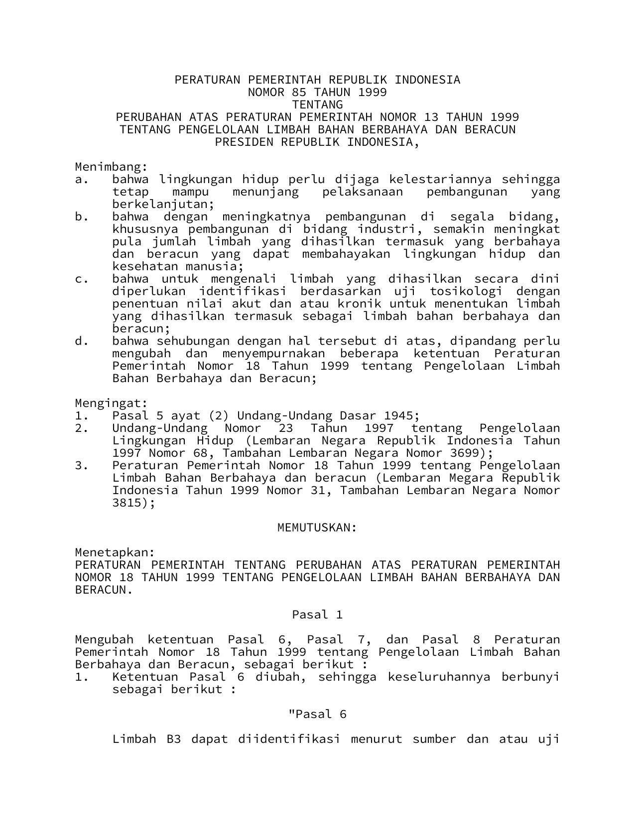 PP Nomor 85 Tahun 1999 | Peraturan Pemerintah Nomor 85 Tahun 1999 tentang PERUBAHAN PP 18-1999 TENTANG PENGELOLAAN LIMBAH BAHAN BERBAHAYA DAN BERACUN