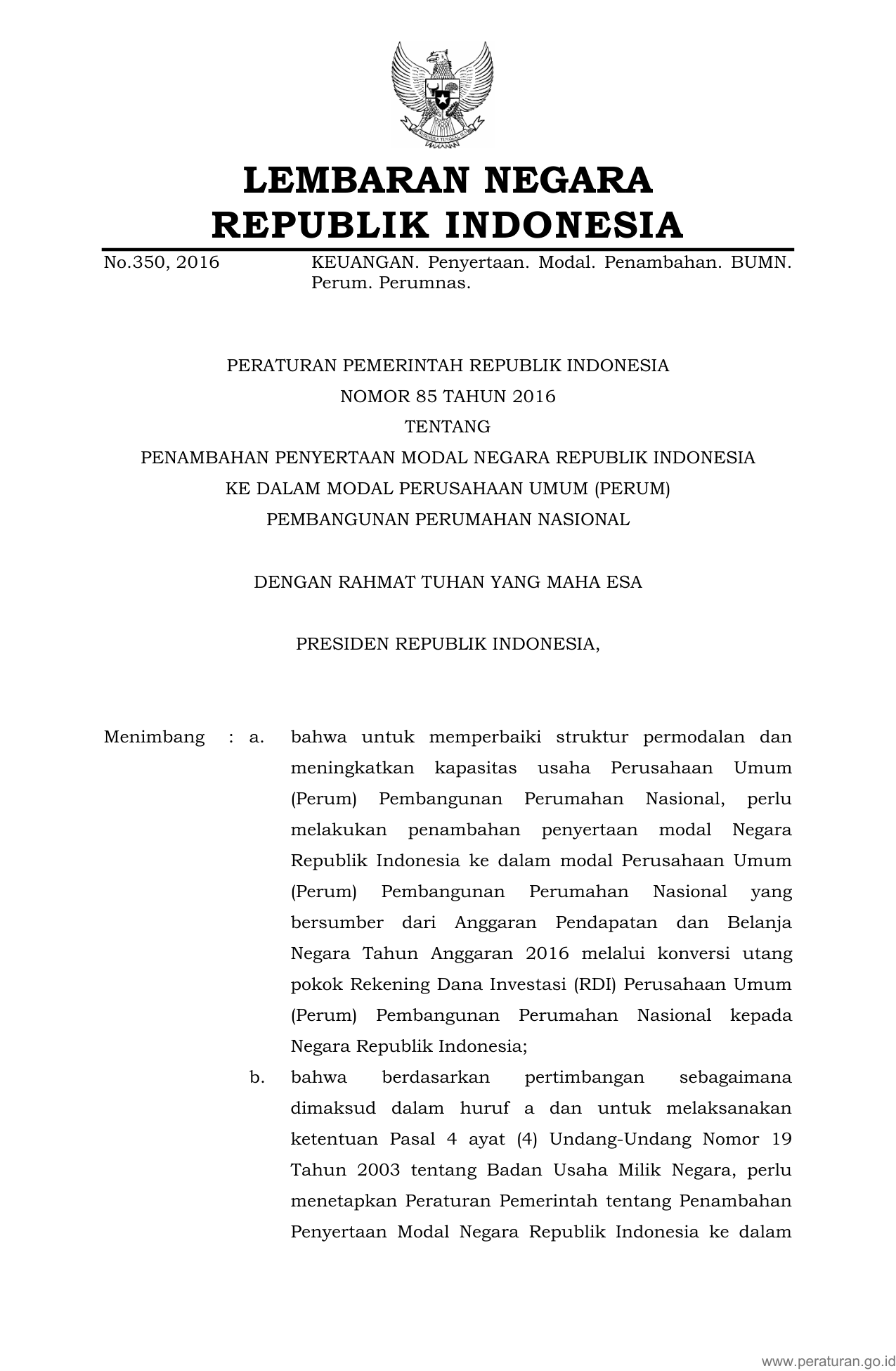 PP Nomor 85 Tahun 2016 | Peraturan Pemerintah Nomor 85 Tahun 2016 tentang Penambahan Penyertaan Modal Negara Republik Indonesia Ke Dalam Modal Perusahaan Umum (Perum) Pembangunan Perumahan Nasional