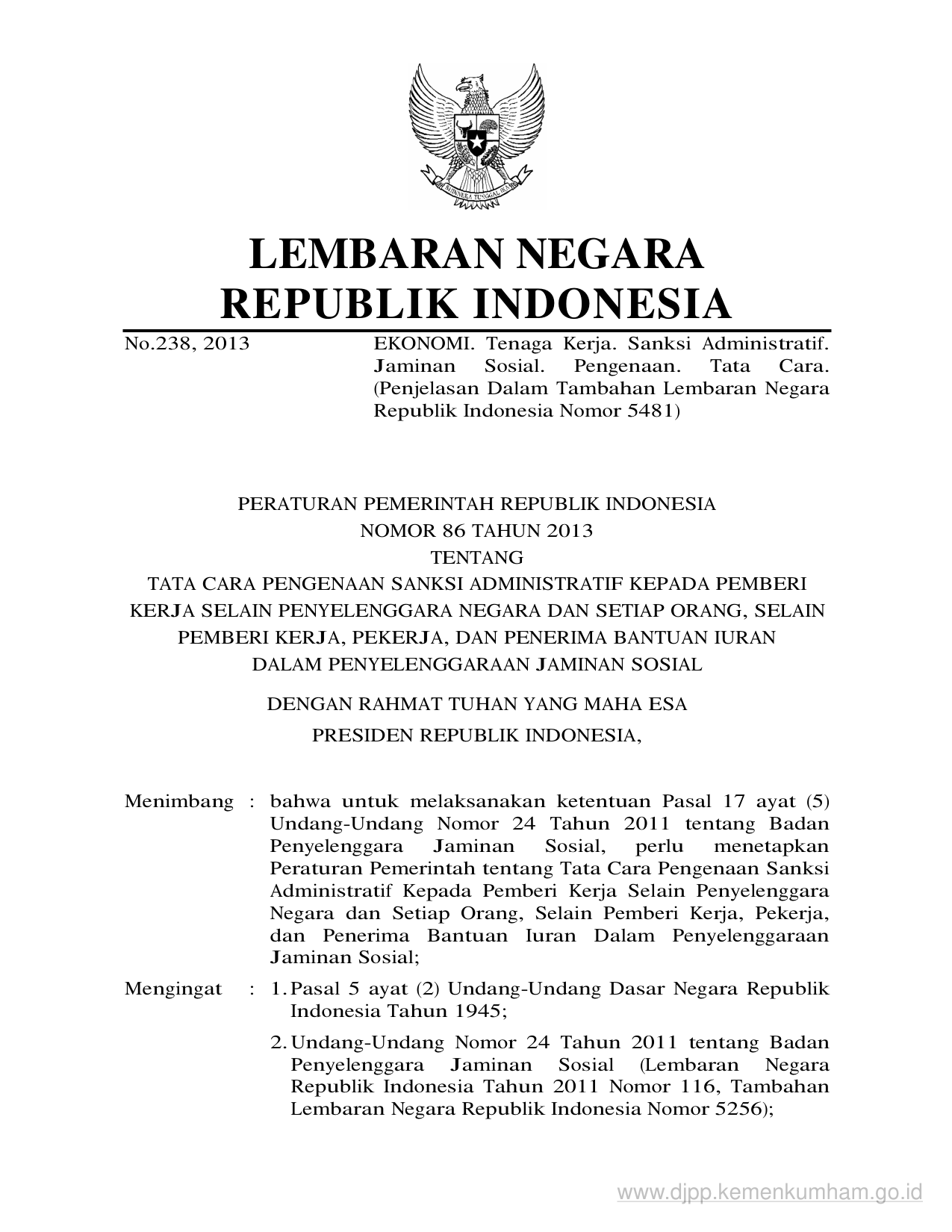 PP Nomor 86 Tahun 2013 | Peraturan Pemerintah Nomor 86 Tahun 2013 tentang TATA CARA PENGENAAN SANKSI ADMINISTRATIF KEPADA PEMBERI KERJA SELAIN PENYELENGGARA NEGARA DAN SETIAP ORANG, SELAIN PEMBERI KERJA, PEKERJA, DAN PENERIMA BANTUAN IURAN DALAM PENYELENGGARAAN JAMINAN SOSIAL